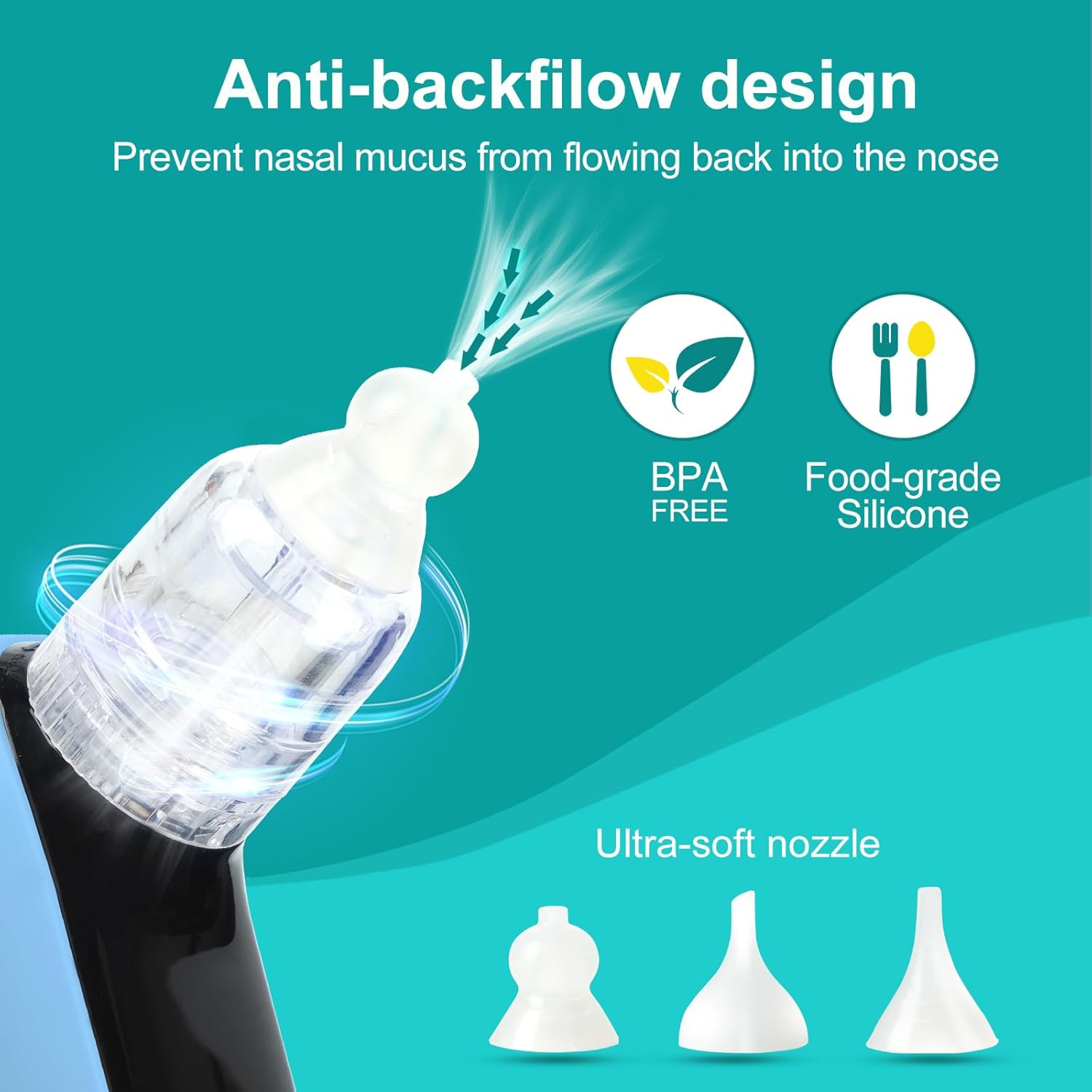 Baby Nasal Aspirator, Baby Nose Sucker, Electric Baby Nasal Aspirator, Anti-Backflow Nose Cleaner with 3 Suction Levels and 2 Silicone Nozzles, Rechargeable Nose Cleaner with Music Soothing Function