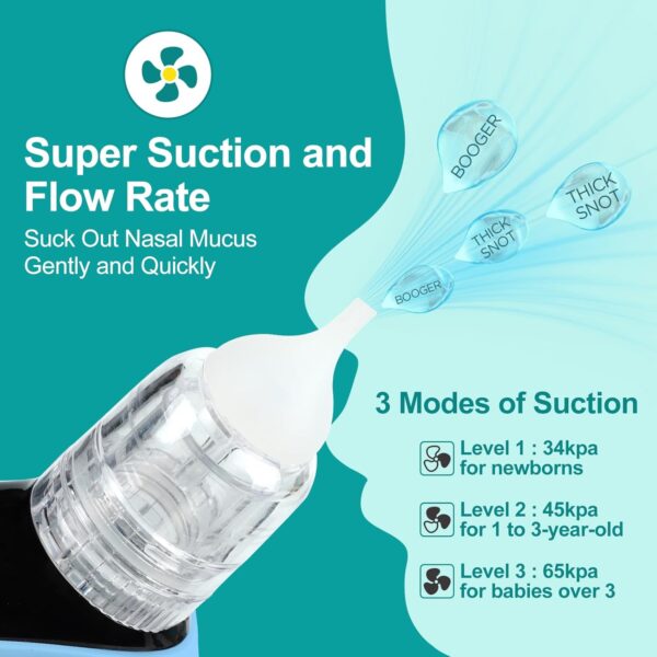 Easy to Clean : Baby Nose Sucker the snot chamber part of the baby nose suction is transparent and removable, allowing you to easily clean the device and can be rinsed with warm soapy wate. Save a lot compared to buying extra filters every time. The fewer parts there are, the easier the disassembly and cleaning process, requiring less effort for reassembly