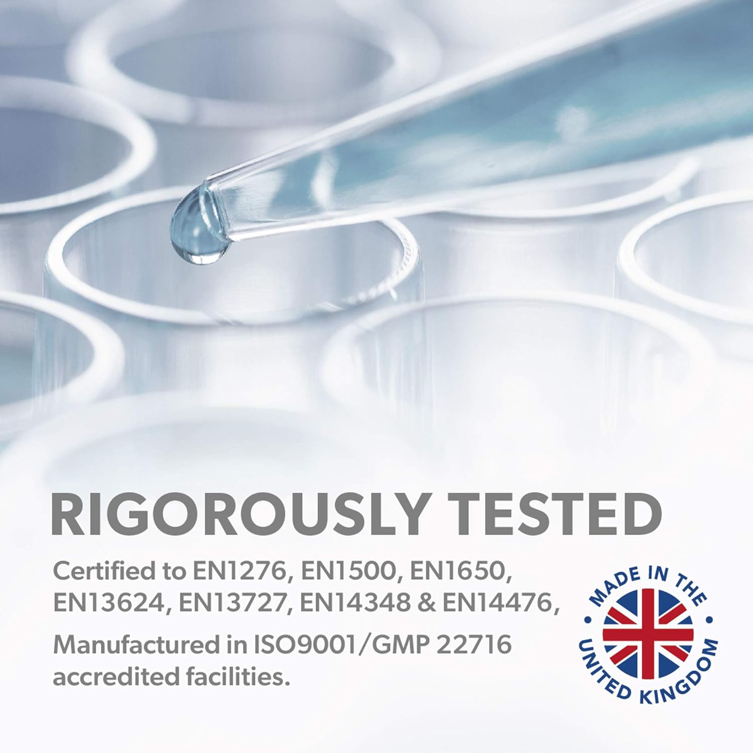 Antibacterial – kills 99.999% of bacteria according to EN 1276, EN 1500 and EN 13727.Virucidal – effective against enveloped viruses according to EN 14476.Yeasticidal according to EN 1650 and EN 13624.Suitable for Surgical / Medical use according to EN 1500, EN 13624 and EN 13727.Suitable for Veterinary use according to EN 1500 and EN 13727.Suitable for Domestic, Food, Industrial and Institutional use according to EN 1276, EN 1500 and EN 1650.Manufactured at a UK based ISO 9001 and GMP 22716 accredited facility.Certification Body: Melbec Microbiology.Certification Date: May 2020.