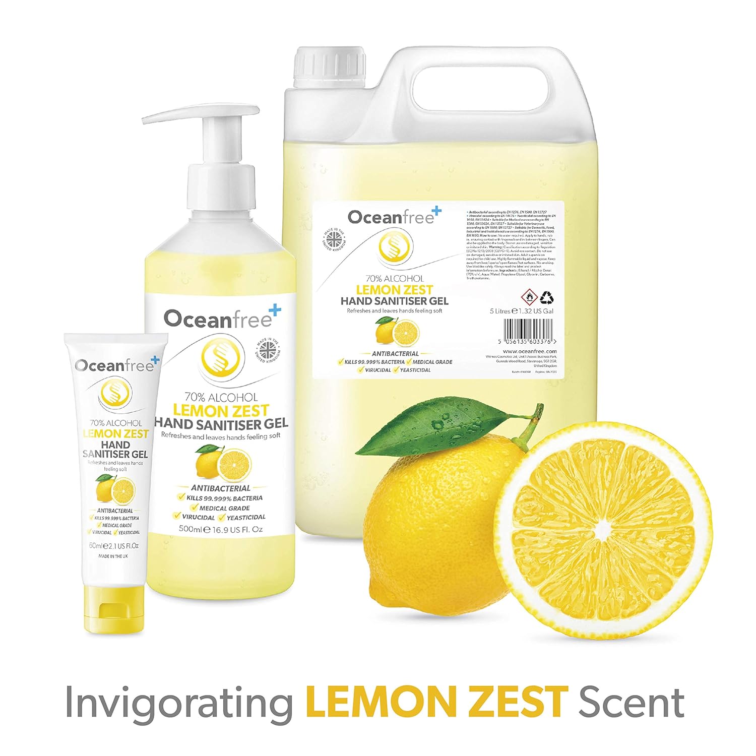 Lemon Zest Hand Sanitiser Gel – 500ml Pump Bottle – 70% Alcohol – Made in the UK (Pack of 2)