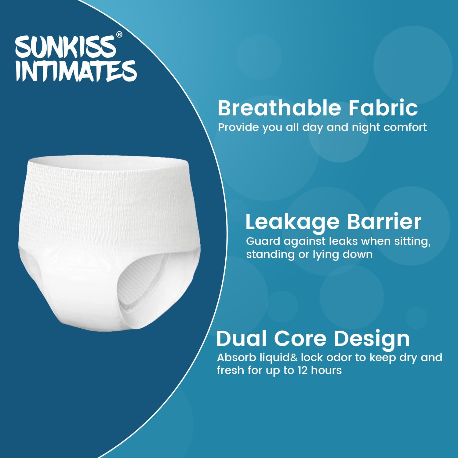 INNOVATIVE PERIOD CARE. SUNKISS INTIMATES disposable period underwear is an unique hybrid between maxi pads and regular underwear, each underwear is individually wrapped, provides you with worry-free protection and ultimate comfort.