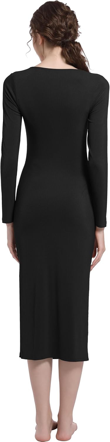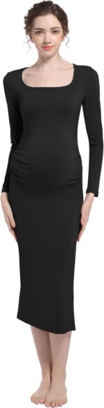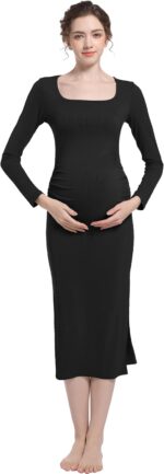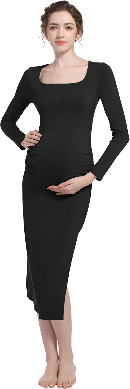 Foucome Maternity Dress Square Neck Long Sleeve Ribbed Slit Bodycon Dress Pregnancy Photoshoot Baby Shower Clothes