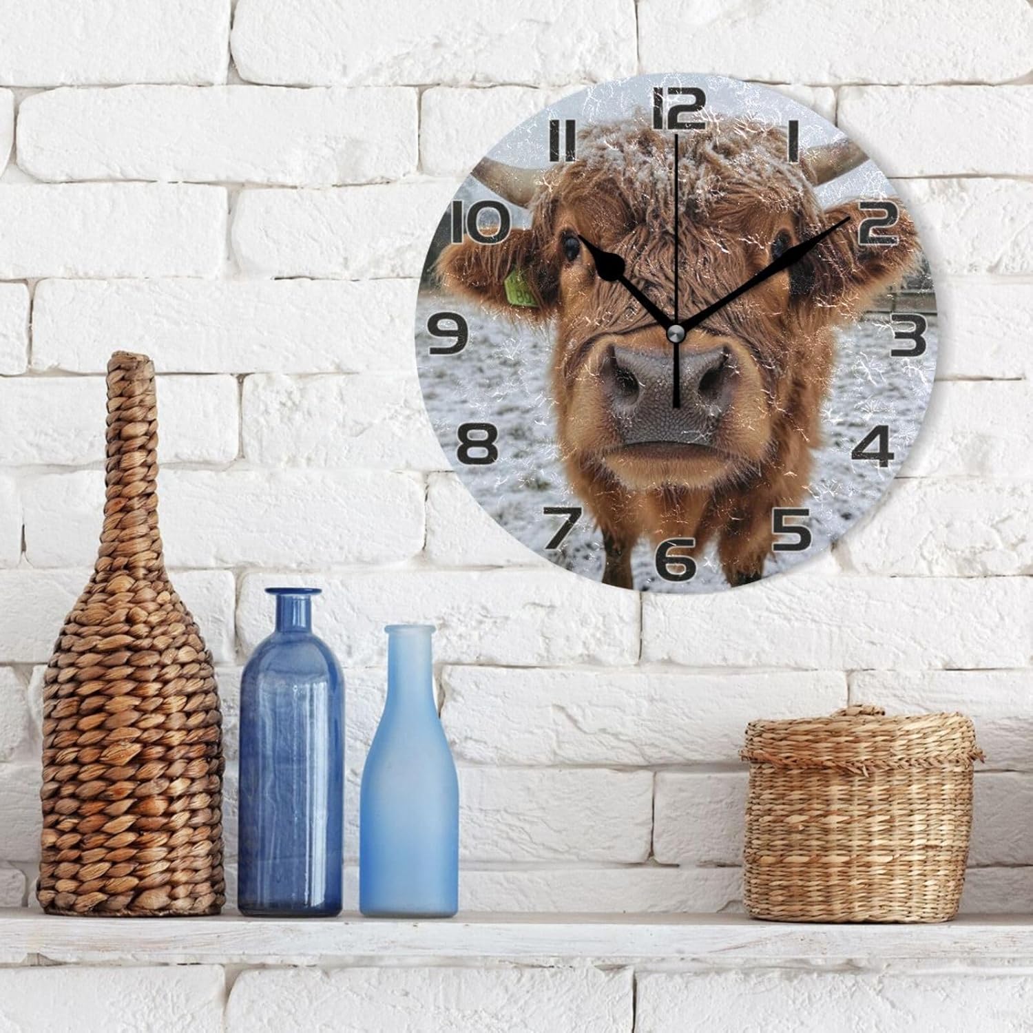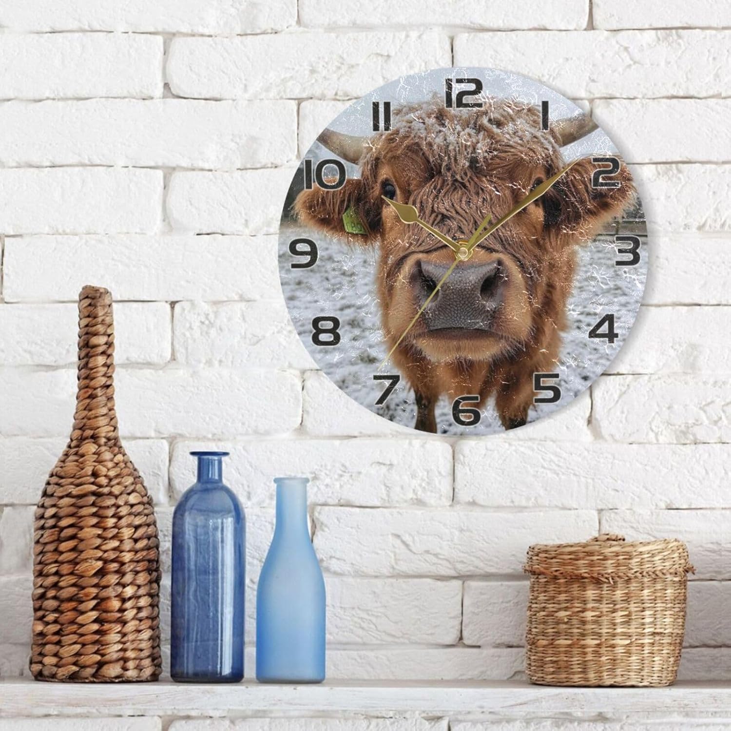 Ewusp Highland Cow Wall Clock Battery Operated Silent Non-Ticking Clock Round Quartz Decorative Clock for Kitchen Living Room Bedroom Office School Nursery, 25×25 cm