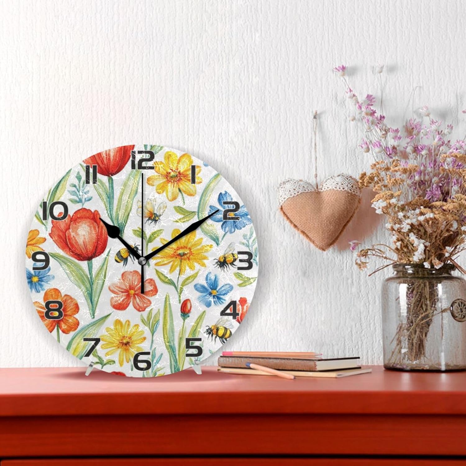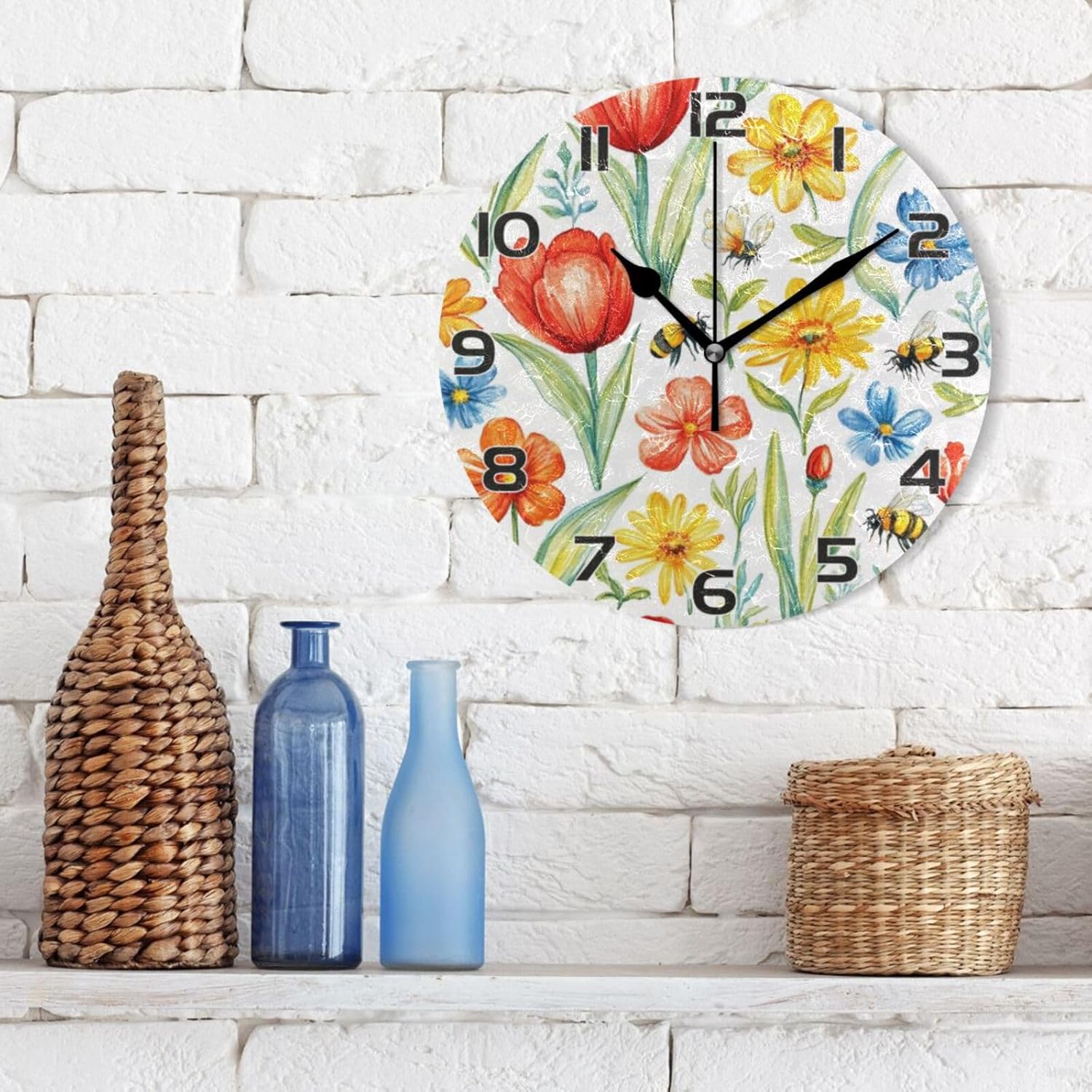 Ewusp Red Yellow Flower Wall Clock Battery Operated Silent Non-Ticking Clock Round Quartz Decorative Clock for Kitchen Living Room Bedroom Office School Nursery, 25×25 cm