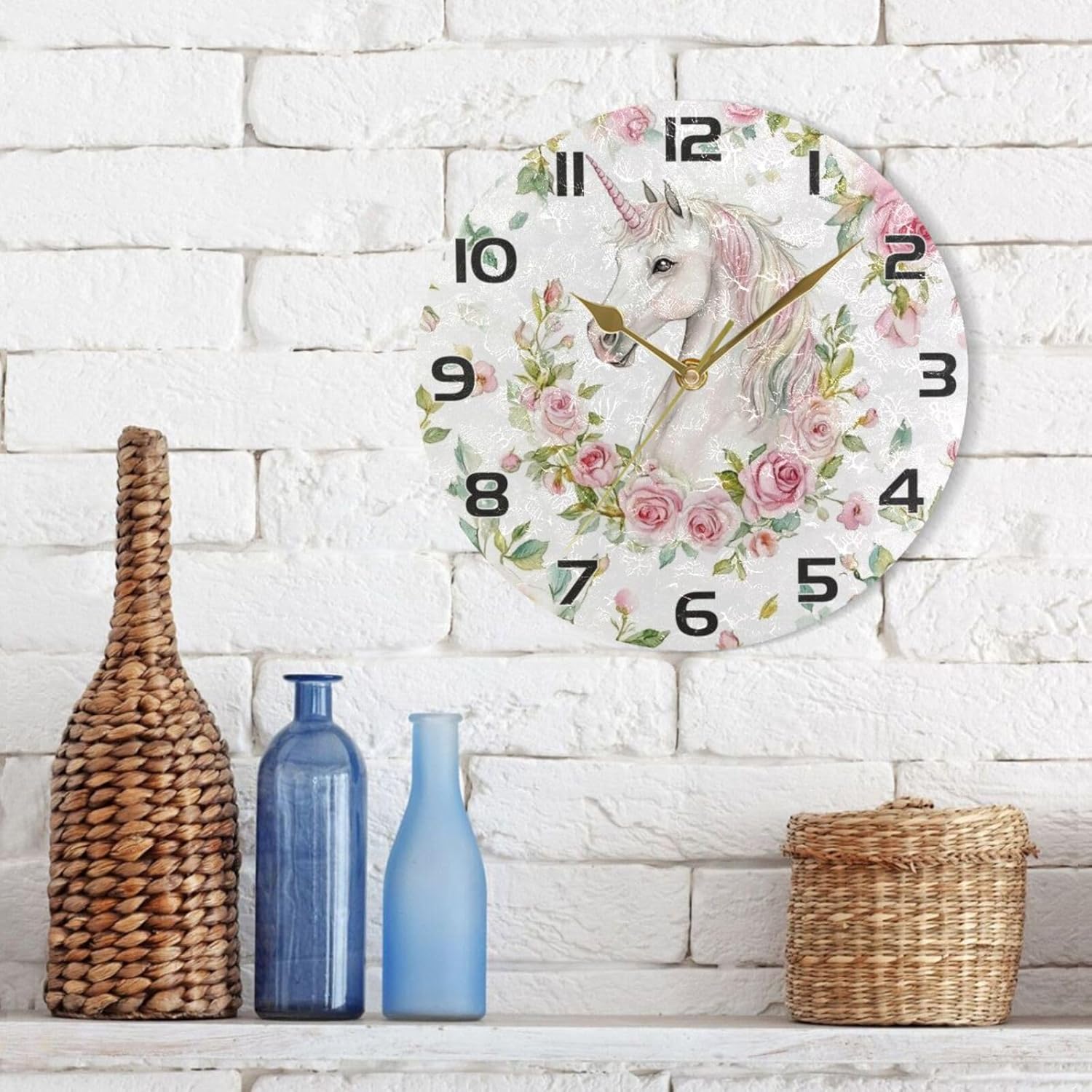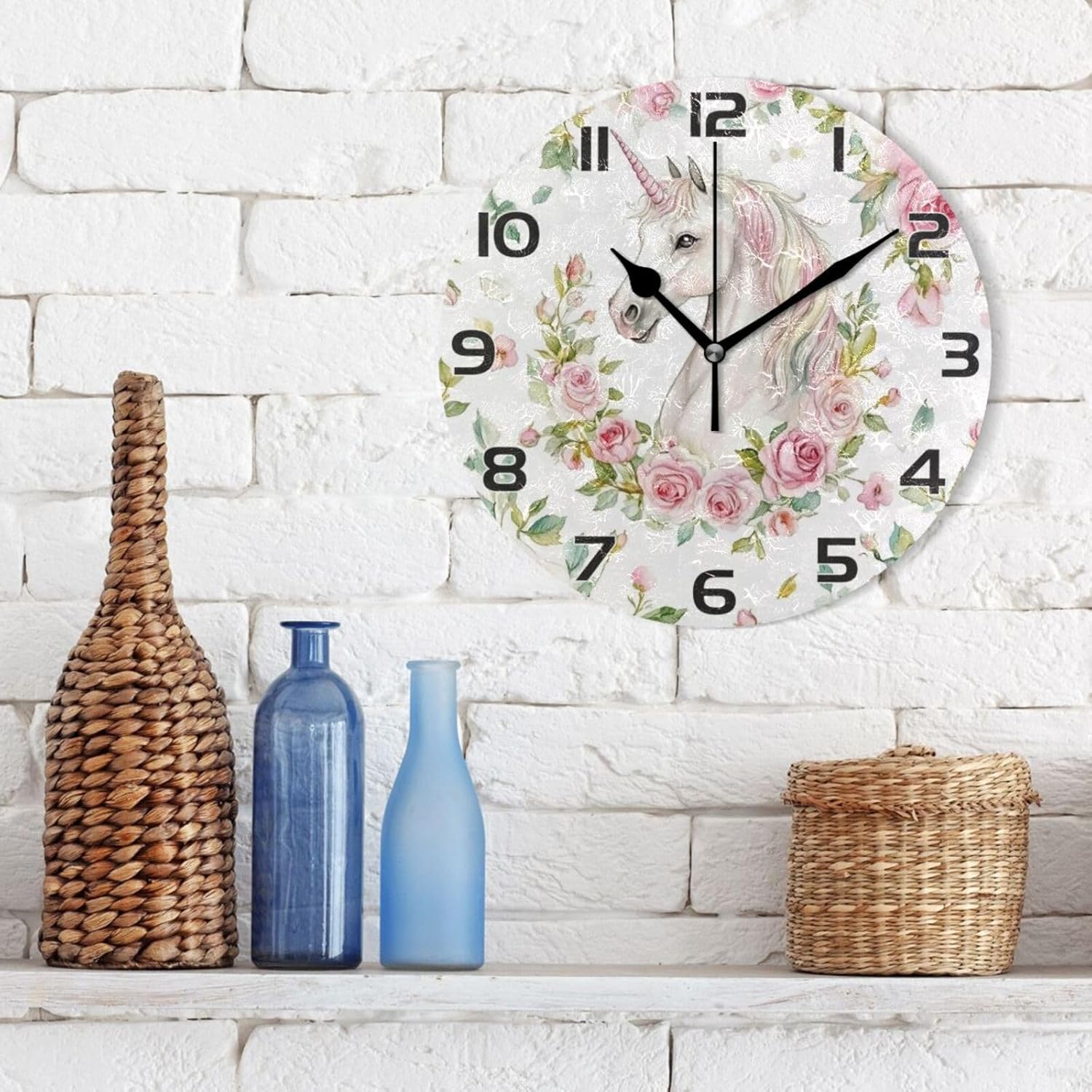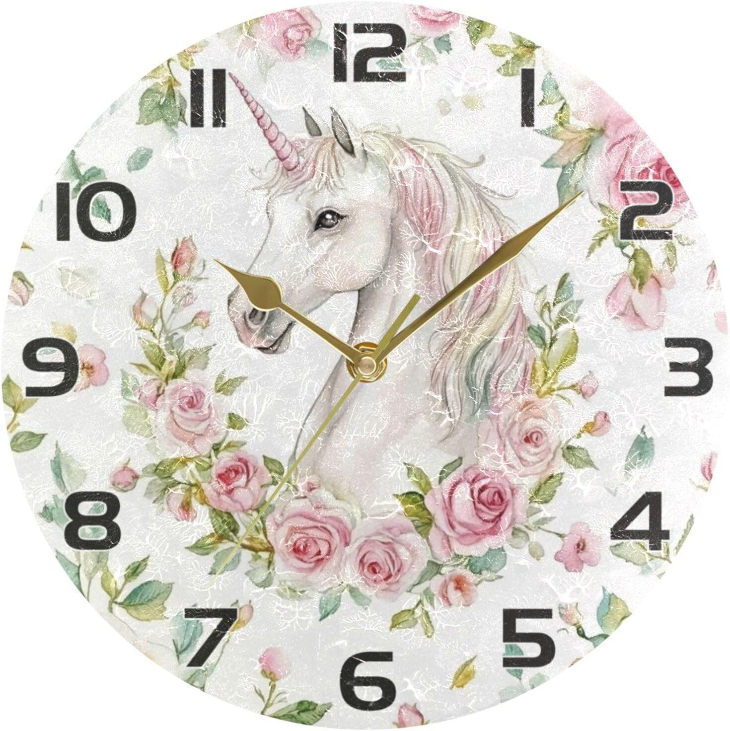 Ewusp Unicorns Flowers Wall Clock Battery Operated Silent Non-Ticking Clock Round Quartz Decorative Clock for Kitchen Living Room Bedroom Office School Nursery, 25×25 cm