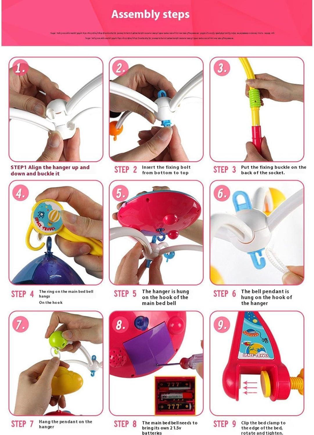 1* Baby Crib Mobile (including 5* pendants, 2* hanger rack, 1* body stick, 1* base, 1* connecting buckle).