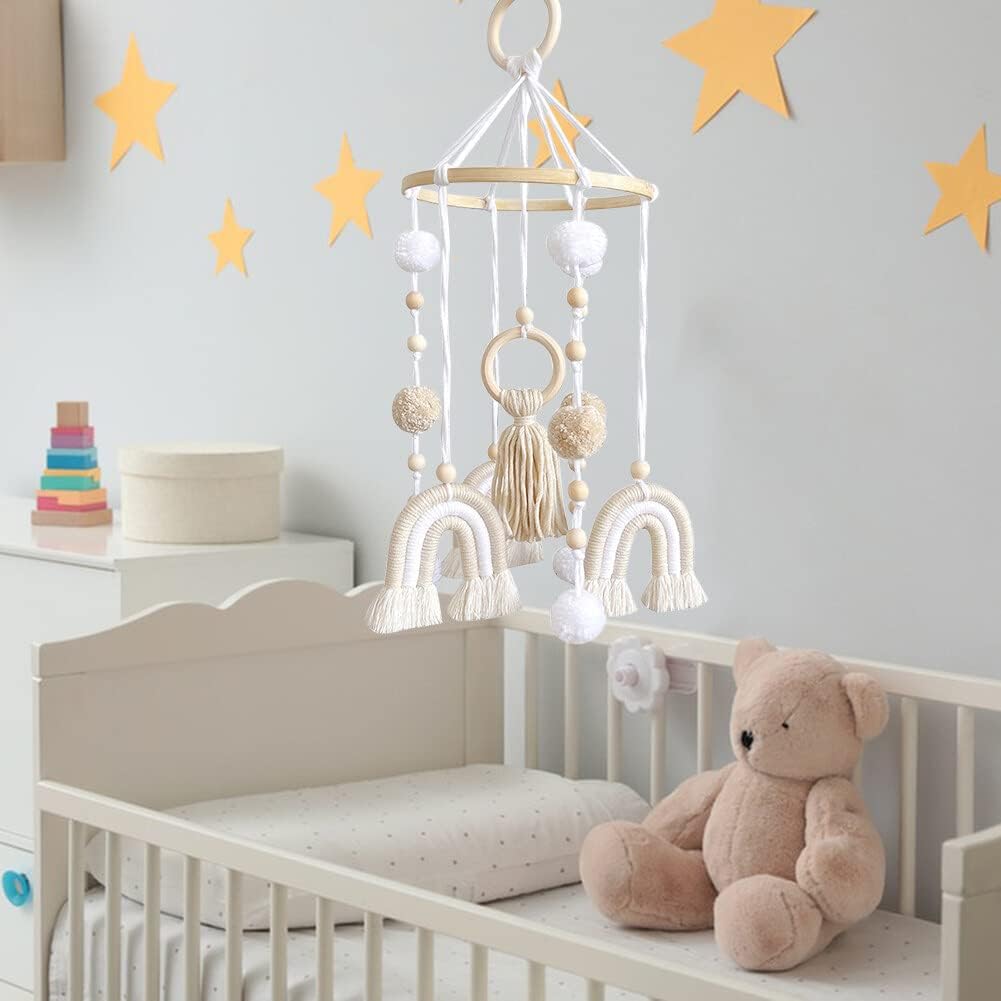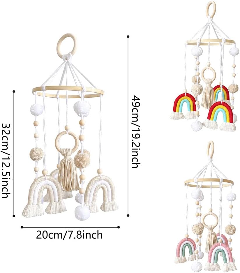 Wooden Cot Mobile Baby Cot Crib Mobile Boho Rainbow Crib Mobile with Wool Balls Baby Bed Mobile Wind Chime Rattle Toy Newborn Nursery Hanging Bed Bell for Boys and Girls