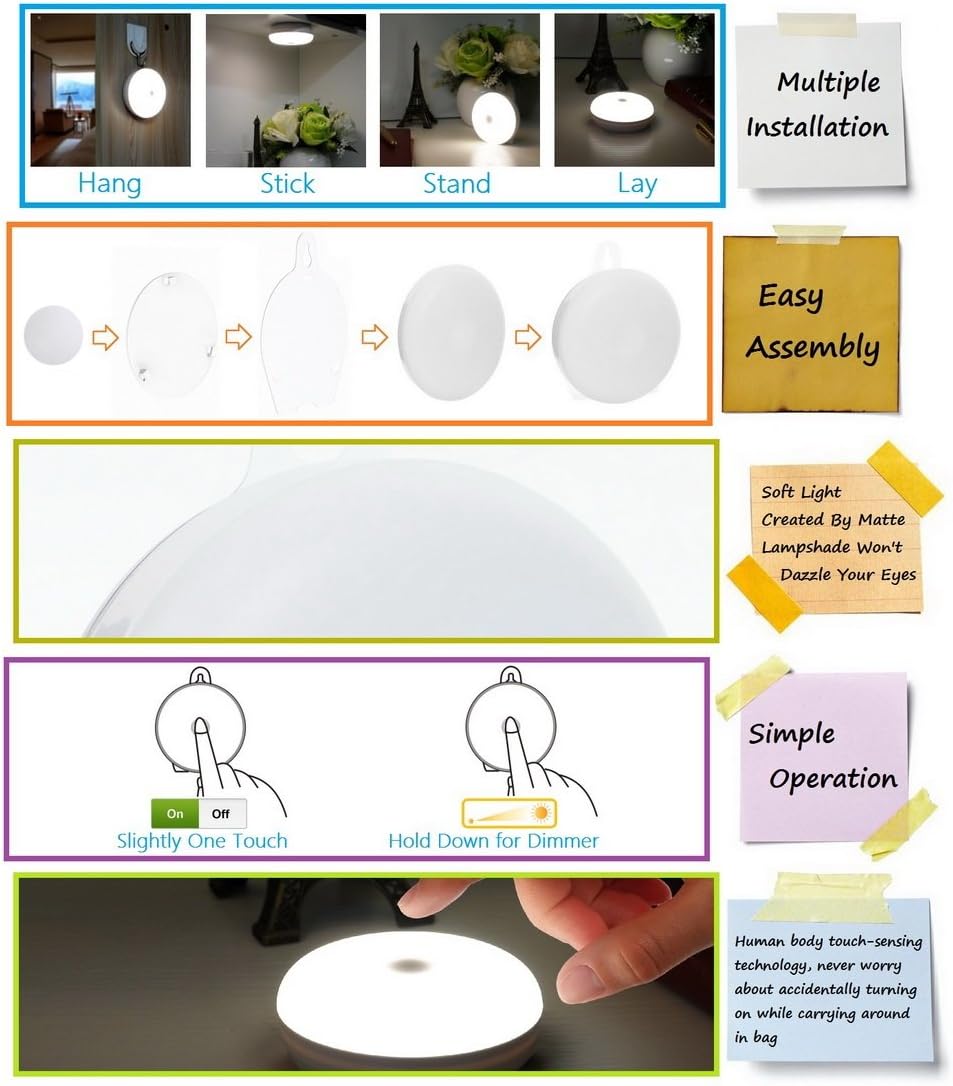 Touch Activated & Rechargeable — Easy to use, simply one short touch on this stick-on night light for power ON/OFF, and long press for brighter or dimmer. Rechargeable by DC 5V Micro USB charging, safe in low voltage, save costs on dry batteries, conveniently no need to change batteries always