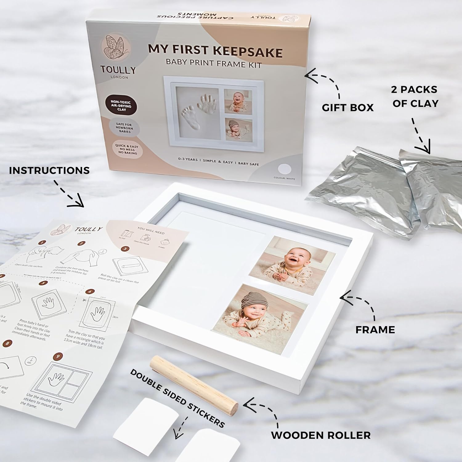 a white picture frameinstructionstwo sachets of white non-toxic clay for creating the perfect impressiona roller for smooth applicationtwo double-sided stickers for securing the clay print in the framea beautiful gift box