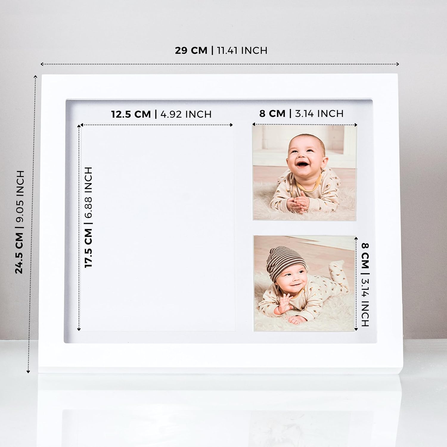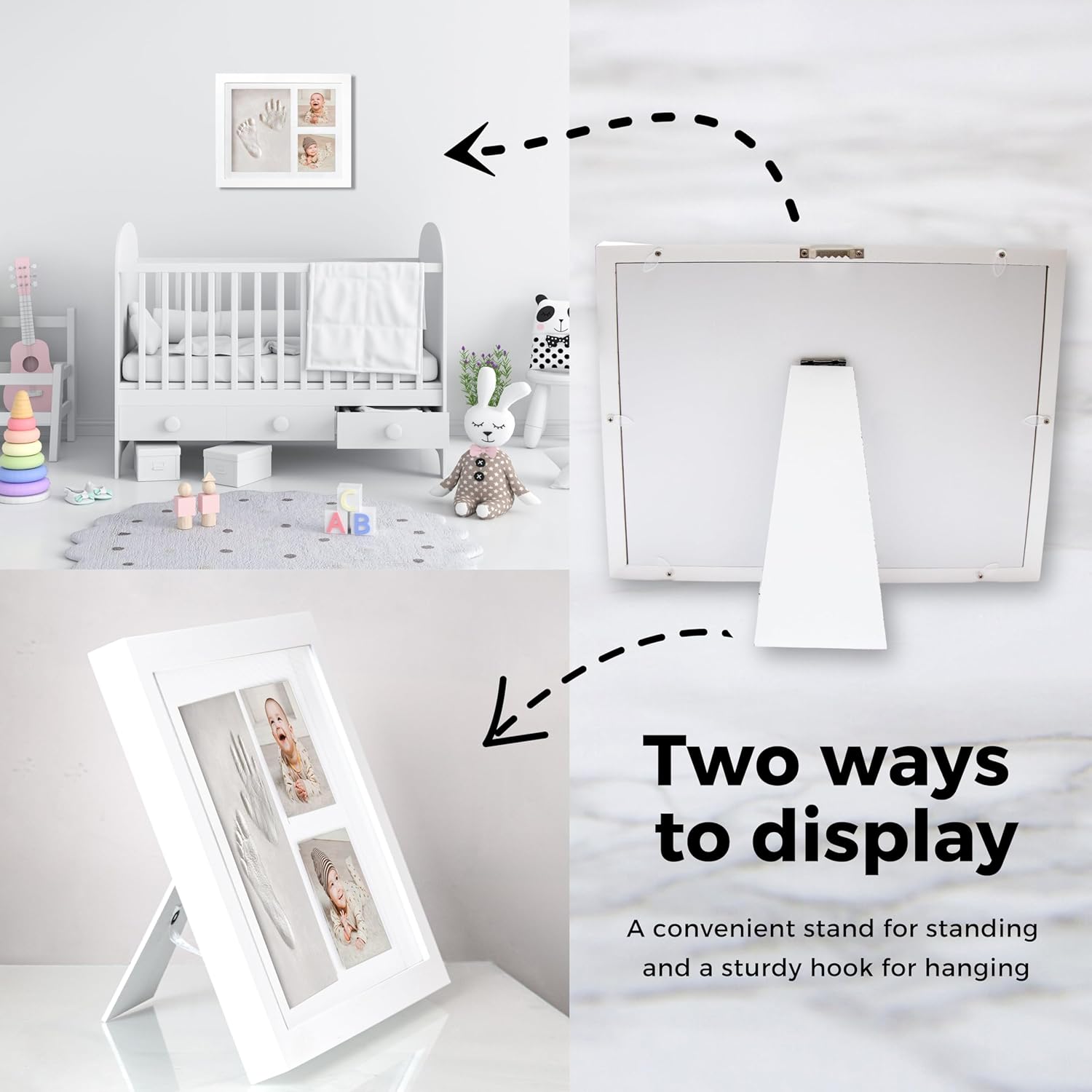 Elegant Frame Design: Includes a high-quality white picture frame with three openings: one for the clay imprint and two for your baby’s adorable photos.