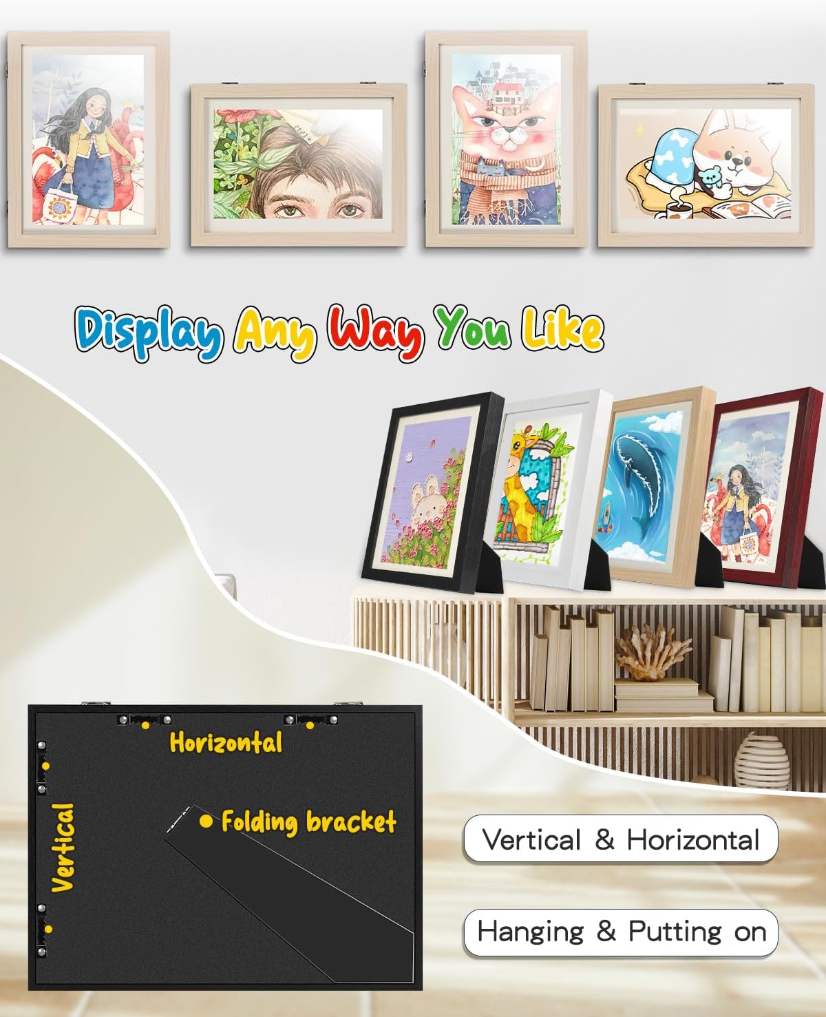 Multi-Ways to Hang and Place: Kids art frame has 4 slots and a tilt pad for horizontal or vertical placement on tables or walls. Perfect for showcasing artwork, photos, crafts, drawings, or postcards, making it easy to display your child’s creations