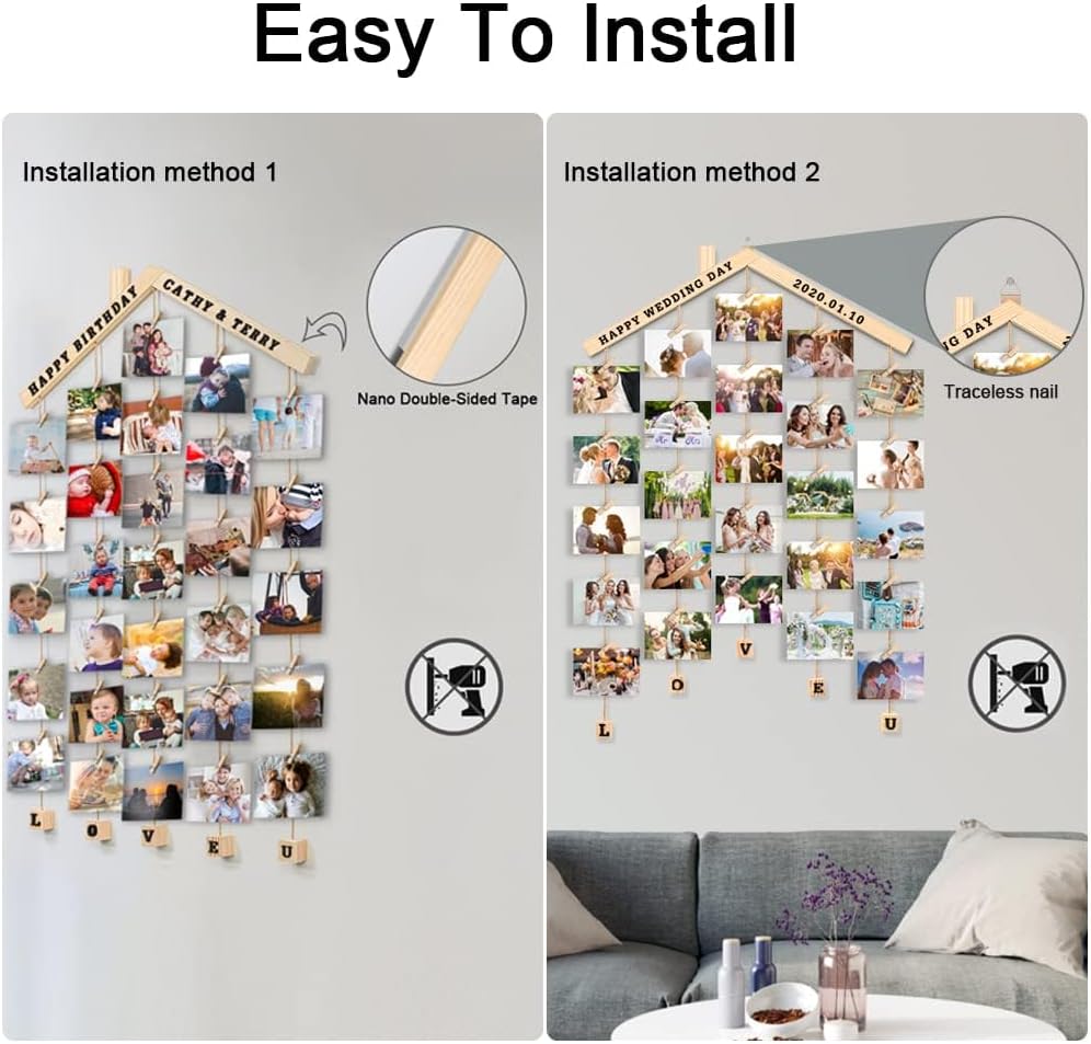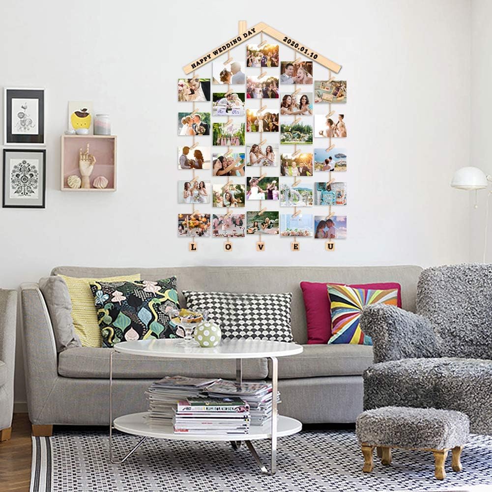 Refresh your room décor any time you want by simply removing, adding or swapping photos thanks to the 30 removable mini clothespins and 5 twine cords.The wall-mounted photo frame is made of high-quality wood and has a natural appearance, which is very suitable for wall decoration in any home or office. It looks great when used as a display photo! In addition, Polaroid photos fit the frame very well.
