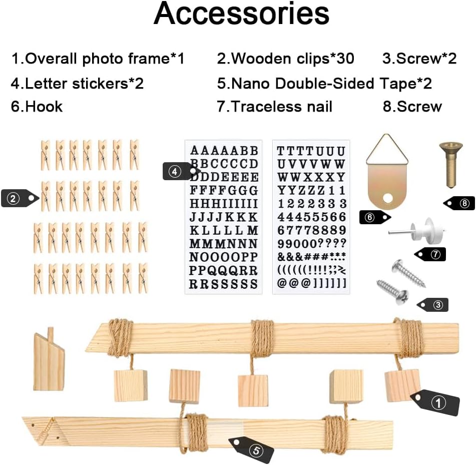 Overall photo framr*1Wooden clips*30Screw*2Letter stickers*2Nano Double-slided Tape*2