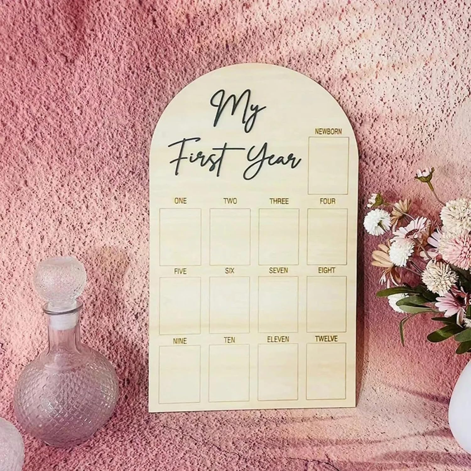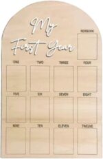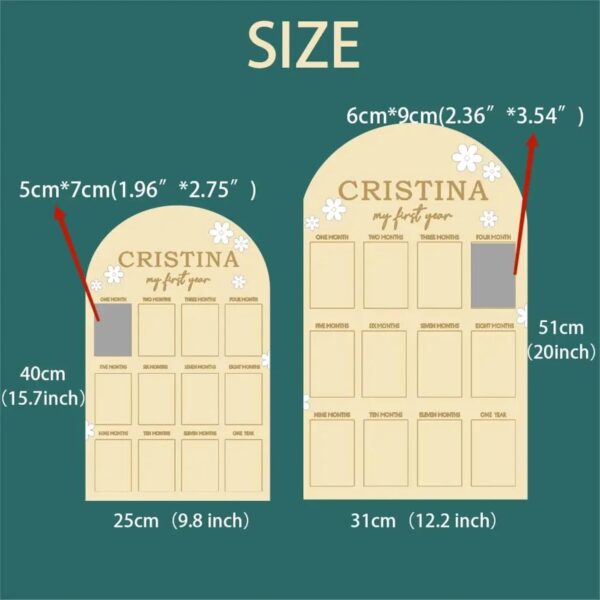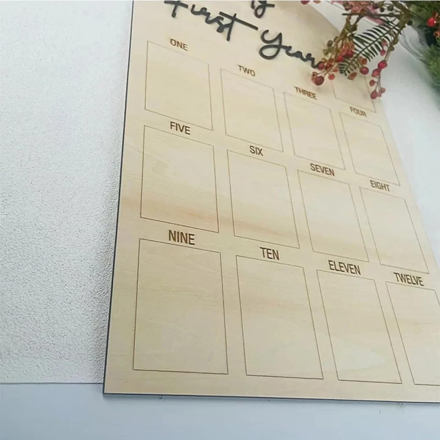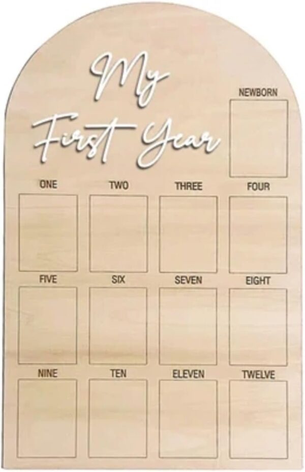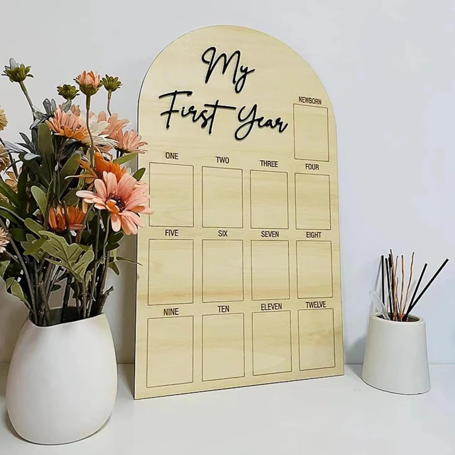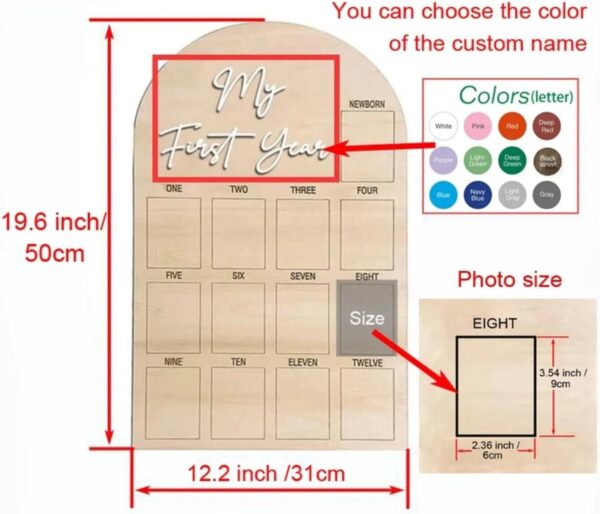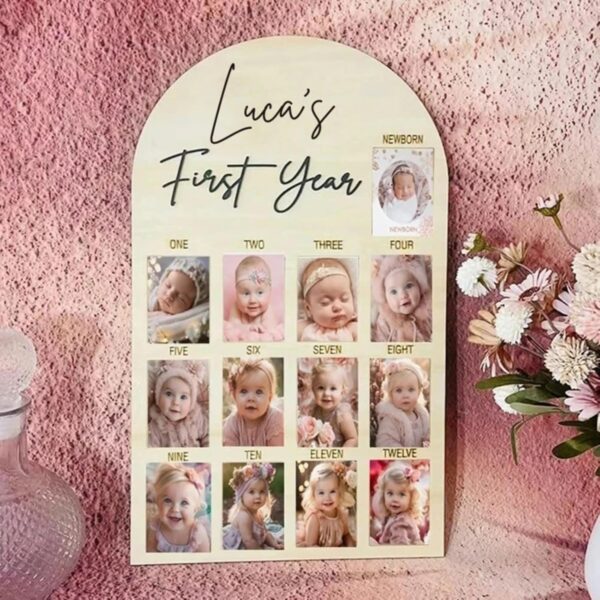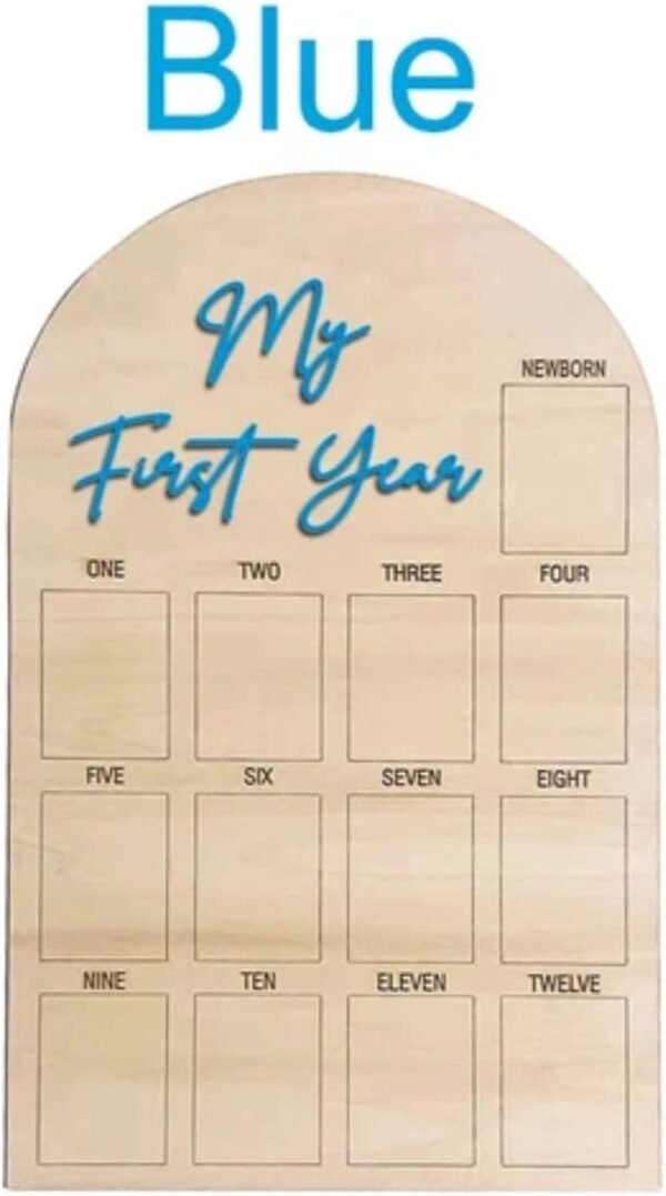 This beautifully crafted one year photo board is the perfect way to commemorate your little one’s first year! Names are 3D done in the color of your choice, all other elements are perfectly. engraved. Show off your baby’s 12 monthly milestones on one of our first year picture board. This is perfect to display at a birthday party and keep as a room décor after.