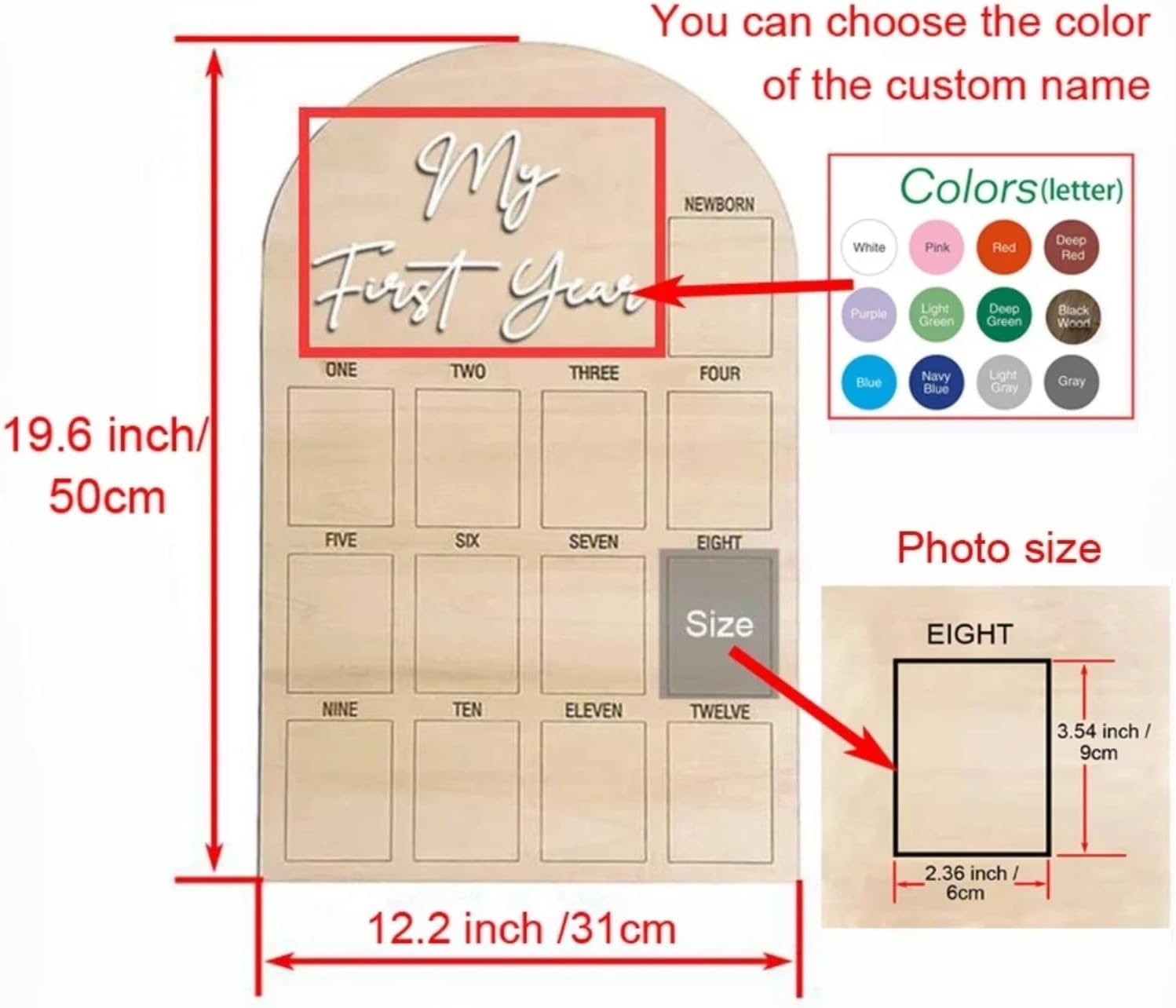 3. Creative and Colourful Design: “My First Year” Custom Baby Name, including 12 different colors, and there are 12 photo spaces.and each photo space is labelled with a number that corresponds to each month of your baby’s first year, making it easy to record and review your baby’s growth each month.