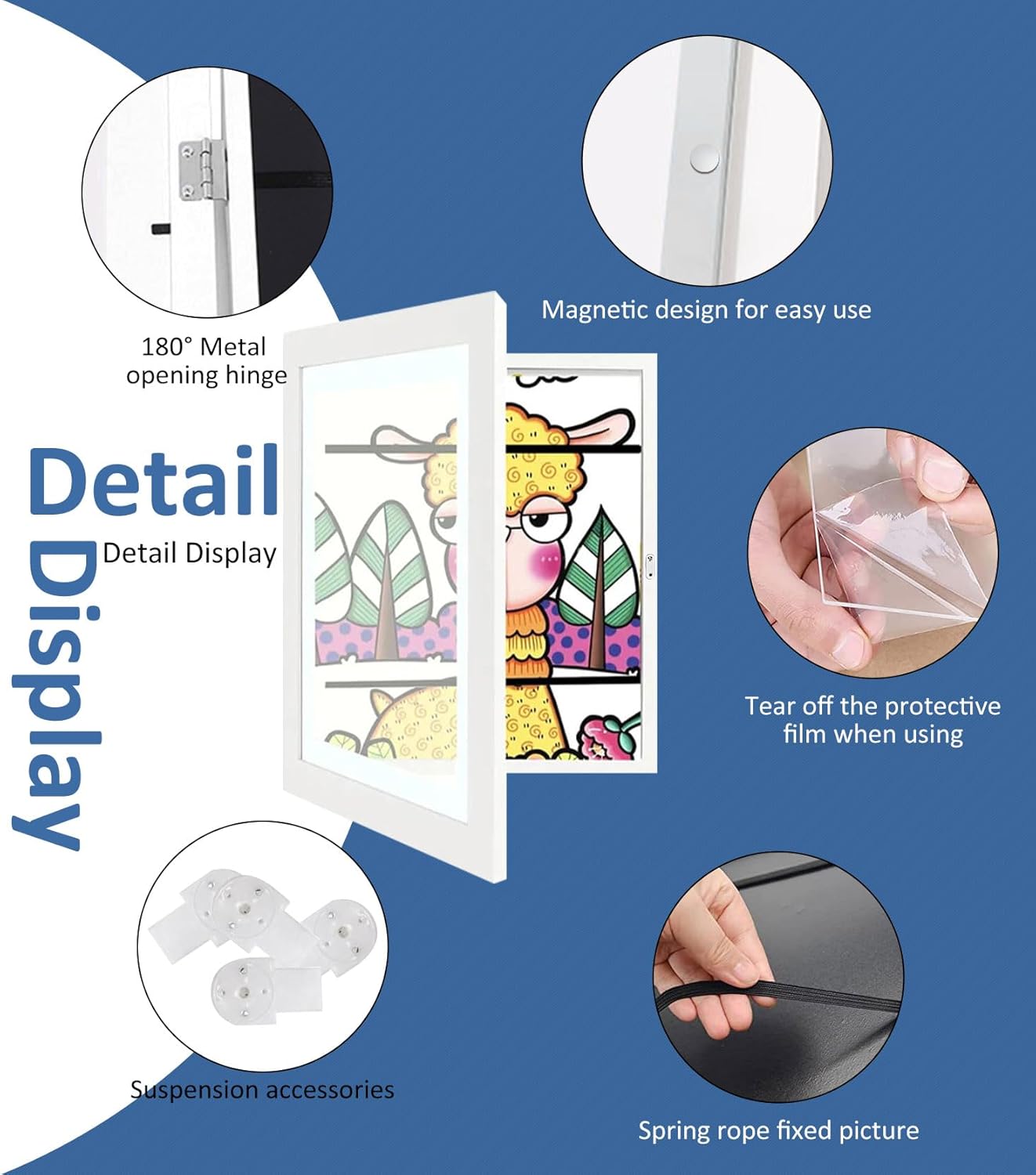 🌷【High Quality Wooden Photo Frame】The kids art photo frame is made of high quality wooden board and glossy acrylic board, simple and classic design, resistant to falling, durable, HD. The modern design of the foldable art frame allows you to present your artworks and photos in the best possible way, giving your artworks a clear view and an artistic atmosphere.