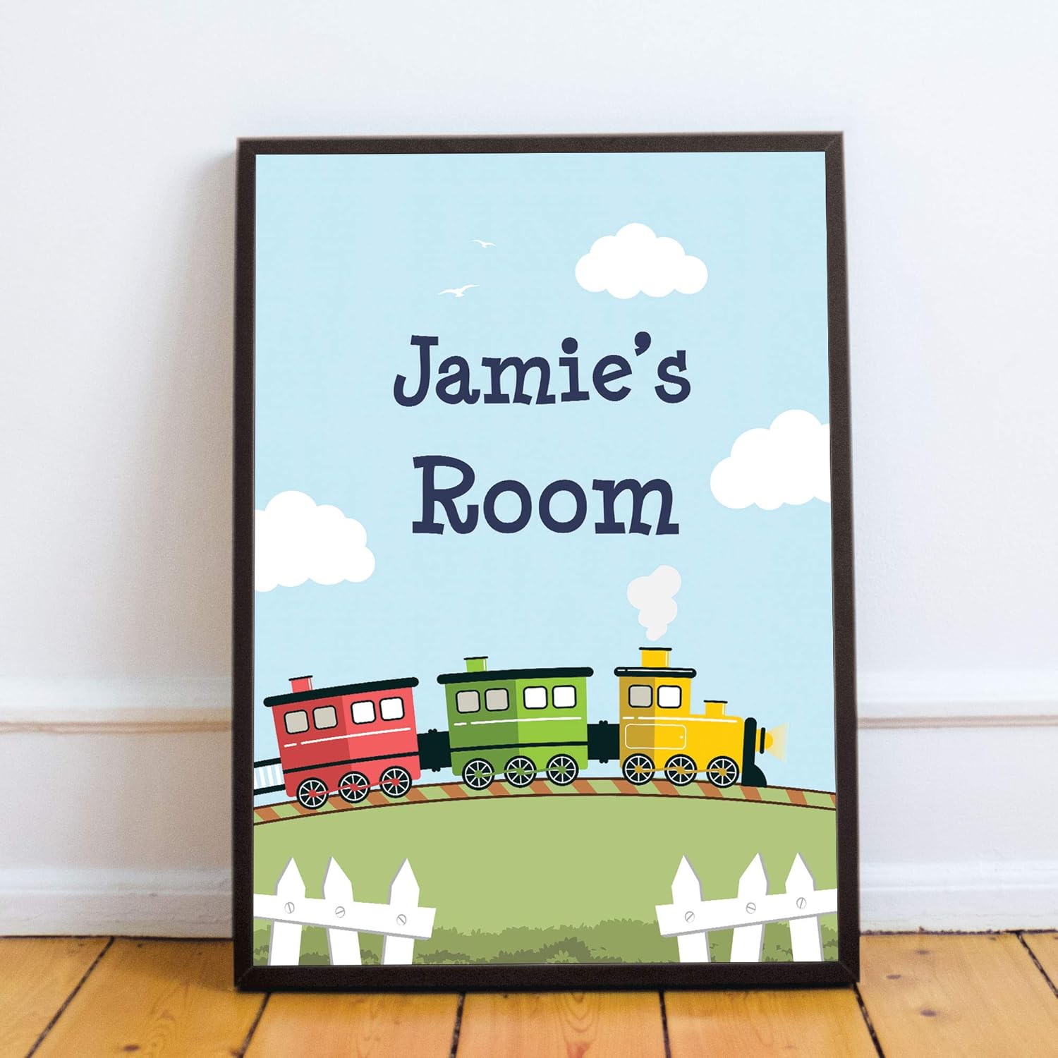 RED OCEAN Personalised Nursery Art Train Print Picture for Baby Toddler Boys Bedroom Decor (A4 Print with Black Frame – PERSONALISED Boys Room Train Theme)