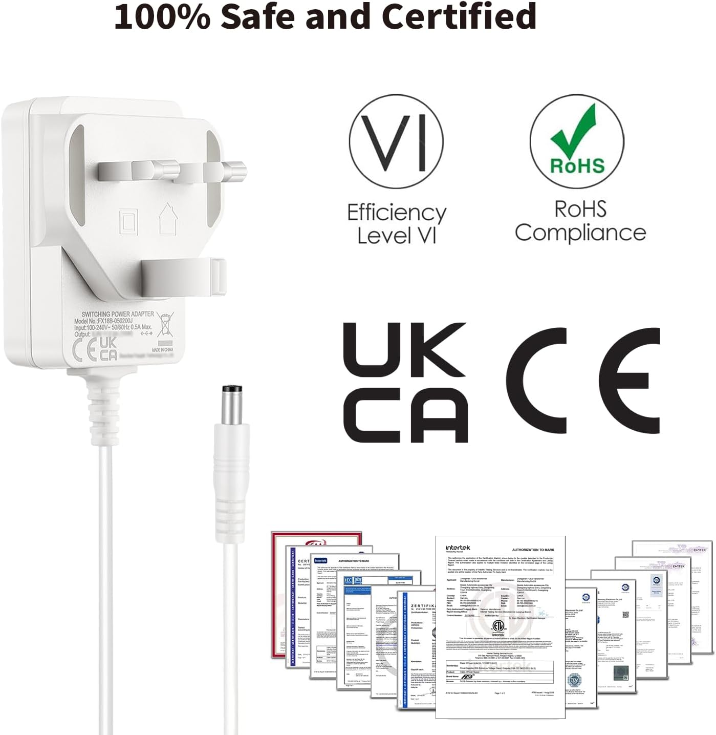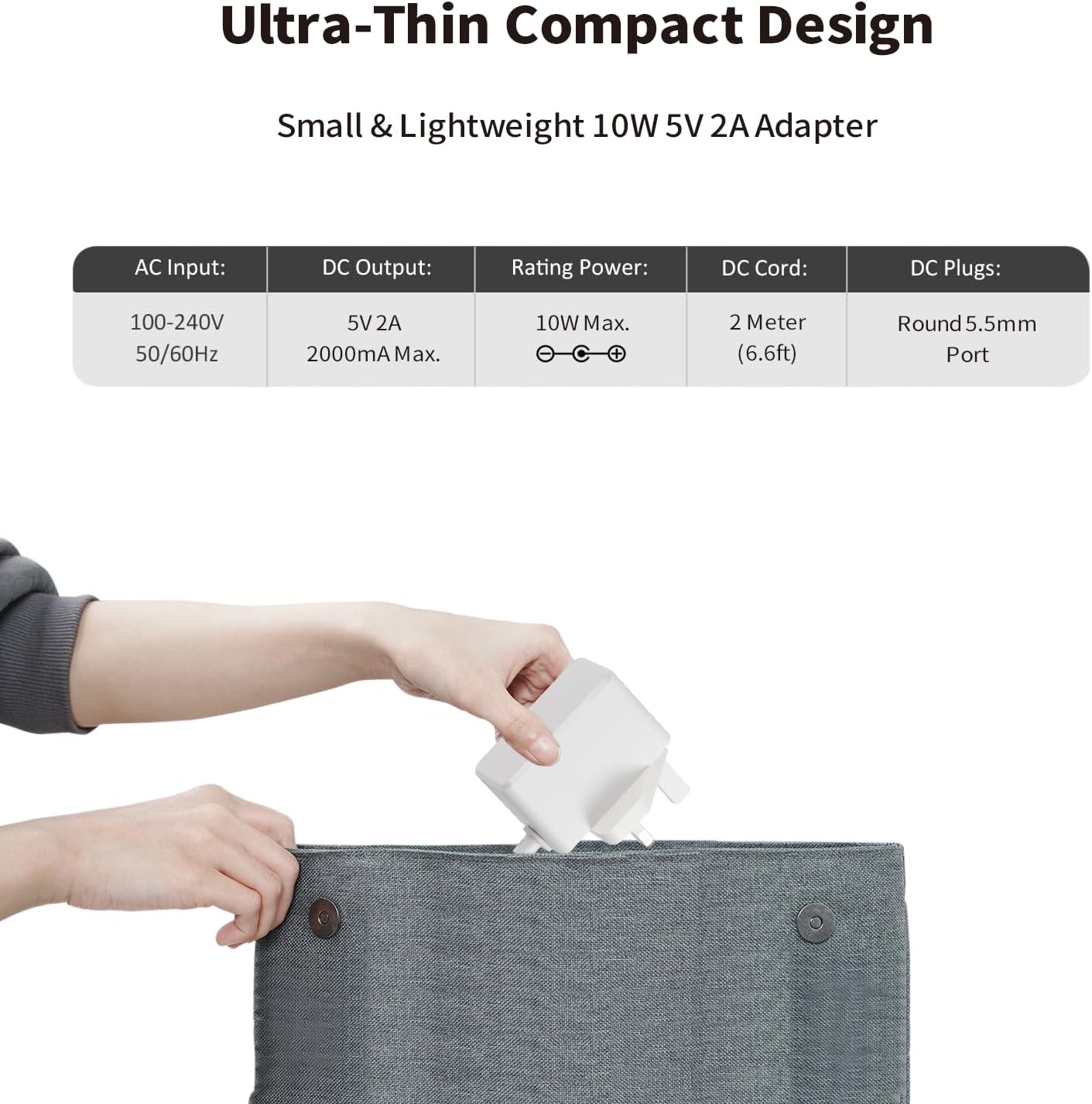 [WIDE COMPATIBILITY] This 5 V 2A AC to DC power adapter is compatible with multiple devices, such as baby monitor, Baby Swing, CCTV cameras, Led Strip Lights, Digital Picture Frame, Android TV Box, Router, Wifi Receiver, Bluetooth Speaker, ADSL Cat, HUB, Android Tablet, Raspberry Pi, MP3/MP4, Video Player, Game Console, Smart Phone and more 5 V electronics.