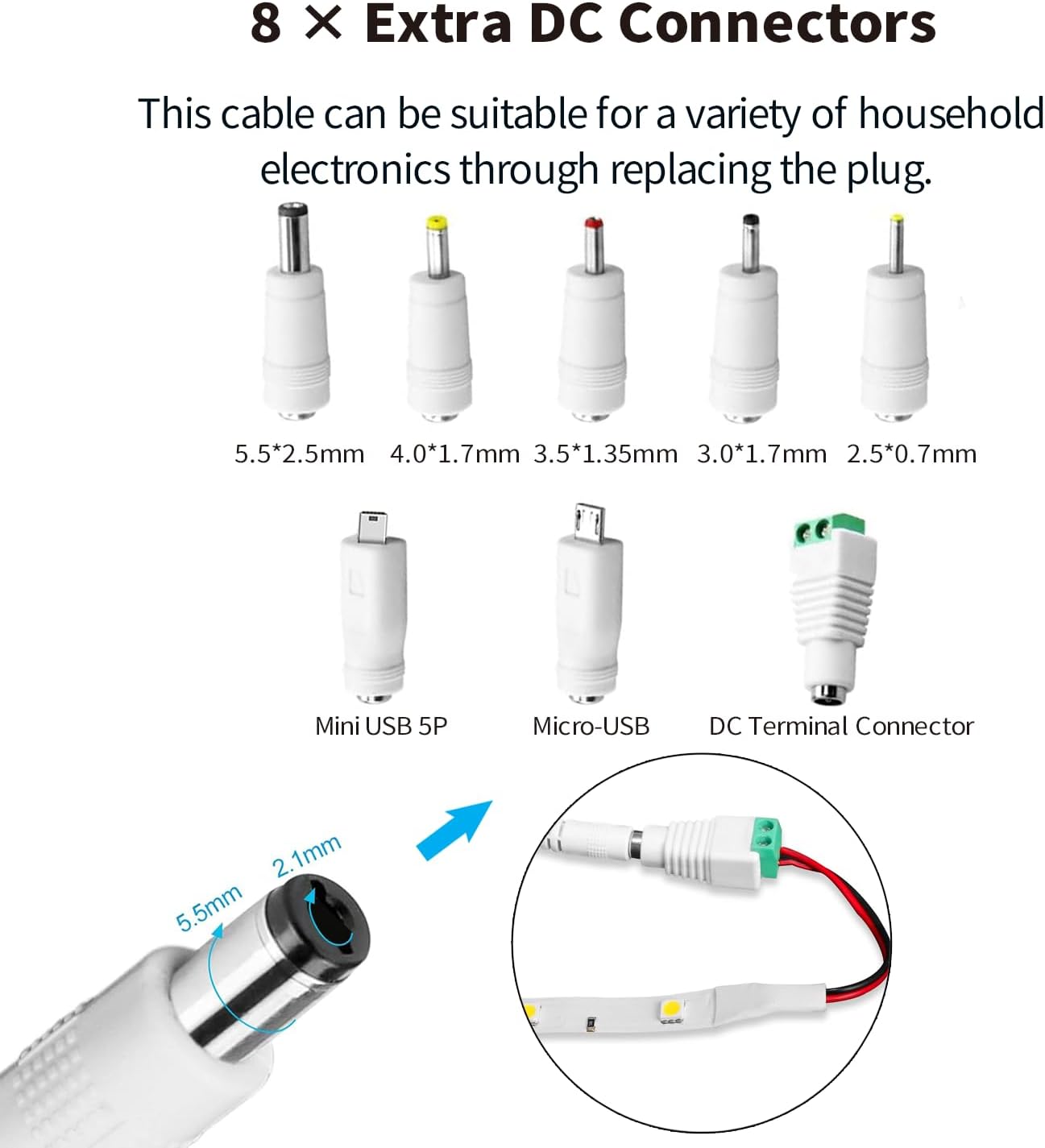 [CUSTOMIZED COMPATIBILITY] This 5 V 2 A power supply is equipped with a variety of 8 different connector tips: 5.5 x 2.5 mm, 4.0 x 1.7 mm, 3.5 x 1.35 mm, 3.0 x 1.7 mm, 2.5 x 0.7 mm, Mini USB, Micro-USB, DC Terminal Connector.
