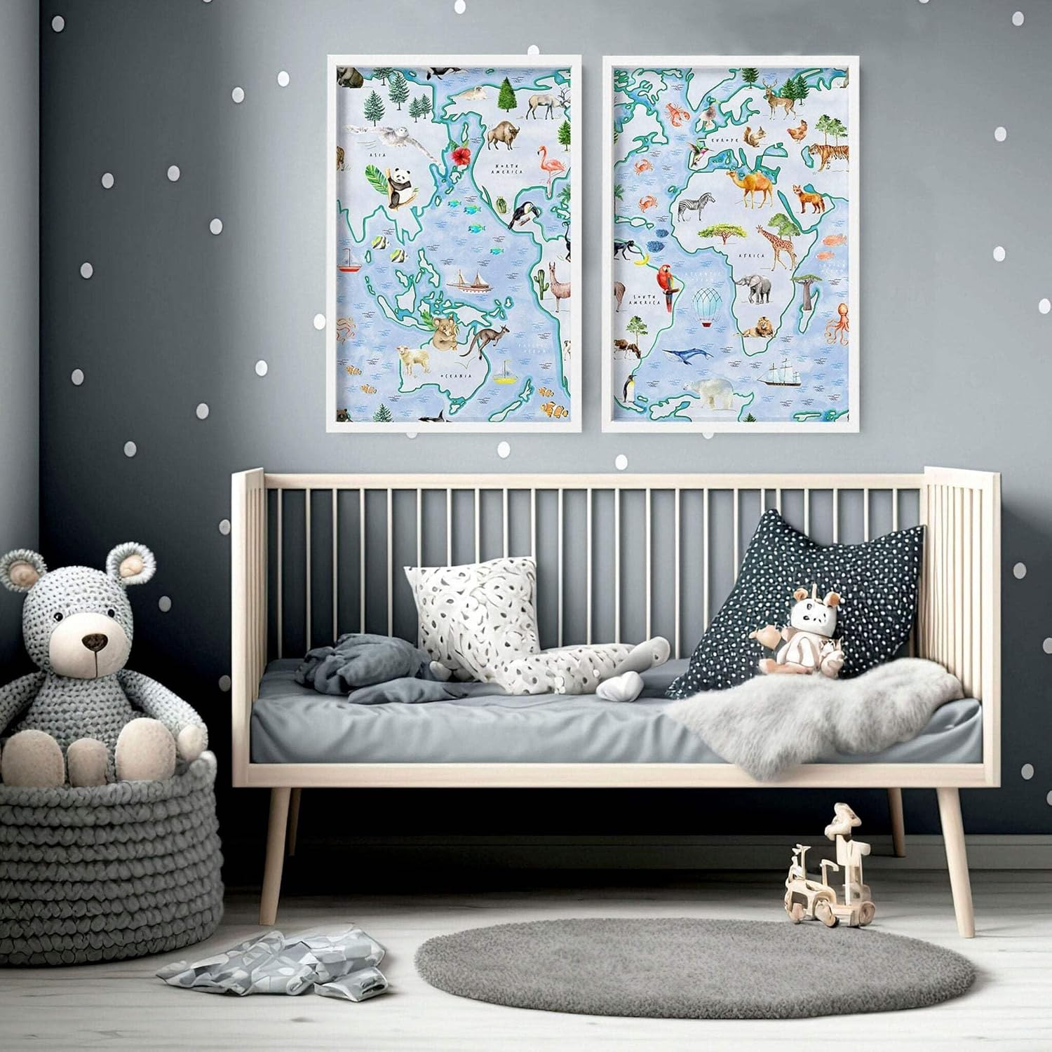 Finally, bring the wonders of the world into your child’s environment with our captivating set of two wall art prints. With its gender-neutral design and ecological message, it is a stunning wall art that inspires exploration and a love for our planet’s diverse wildlife.Children’s world map | set of 2 Wall art for Nursery details:You will receive 2 non-framed Educational Map of the