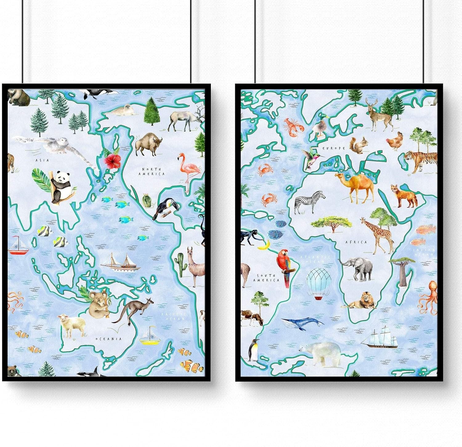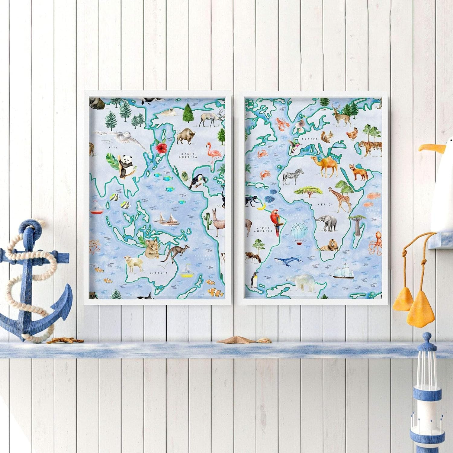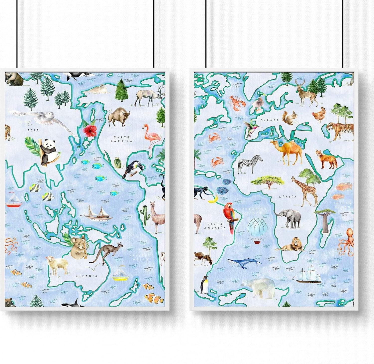 Enhance your little one’s learning and curiosity with our captivating set of two Childrens world map wall art prints. This educational artwork showcases specific animals from each geographical location. It is a perfect addition to a playroom, nursery, or baby boy’s room.