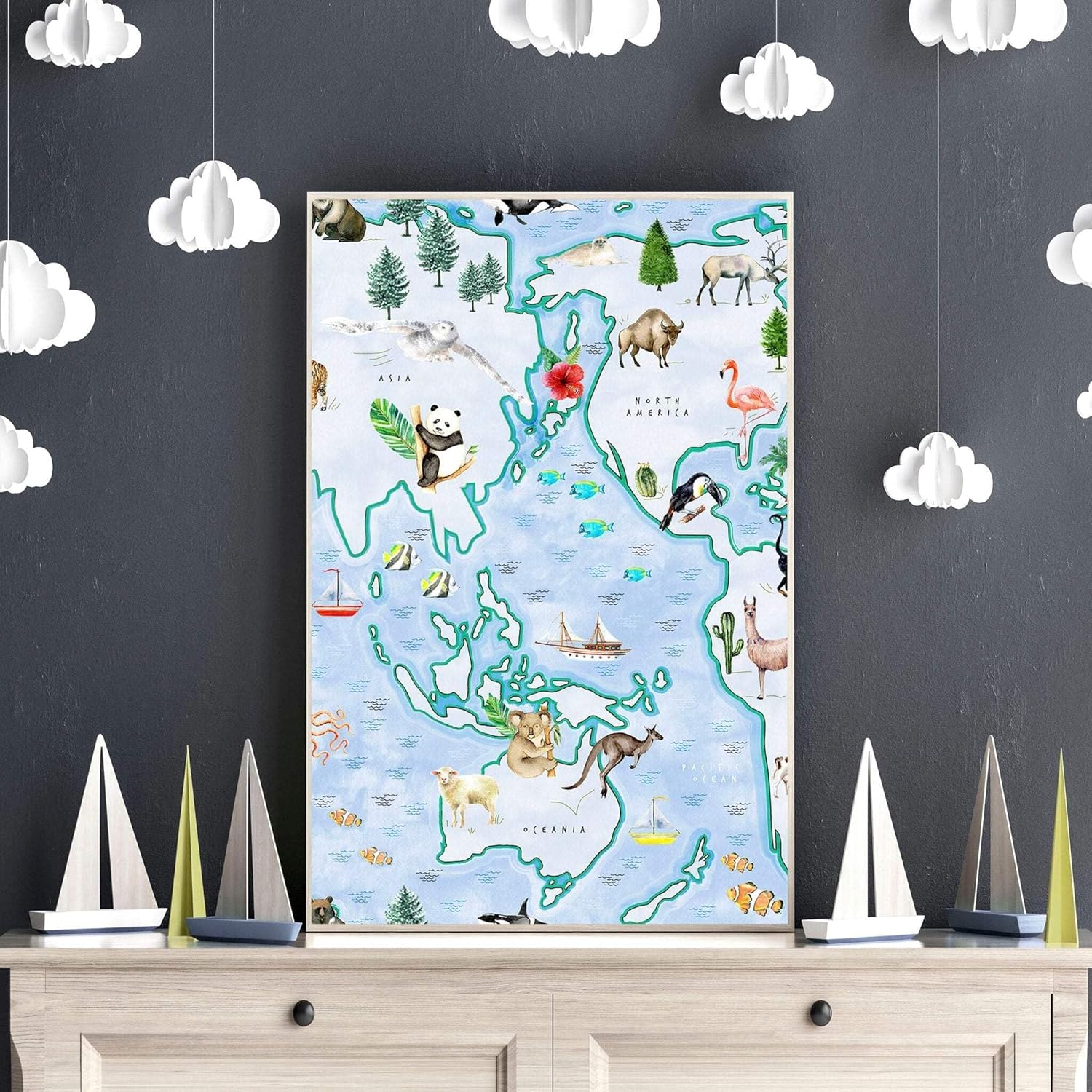 The watercolour Childrens world map indeed serves as an engaging and interactive tool for teaching geography and animal recognition. Your child will discover various animals from around the globe. These art prints will foster his love for wildlife and expand his knowledge.