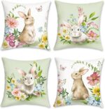 Bonhause Spring Bunny Cushion Covers 45 x 45 cm Rabbits Flowers Double Sided Decorative Throw Pillow Covers Green Pillowcases for Sofa Couch Garden Patio Home Decor Set of 4