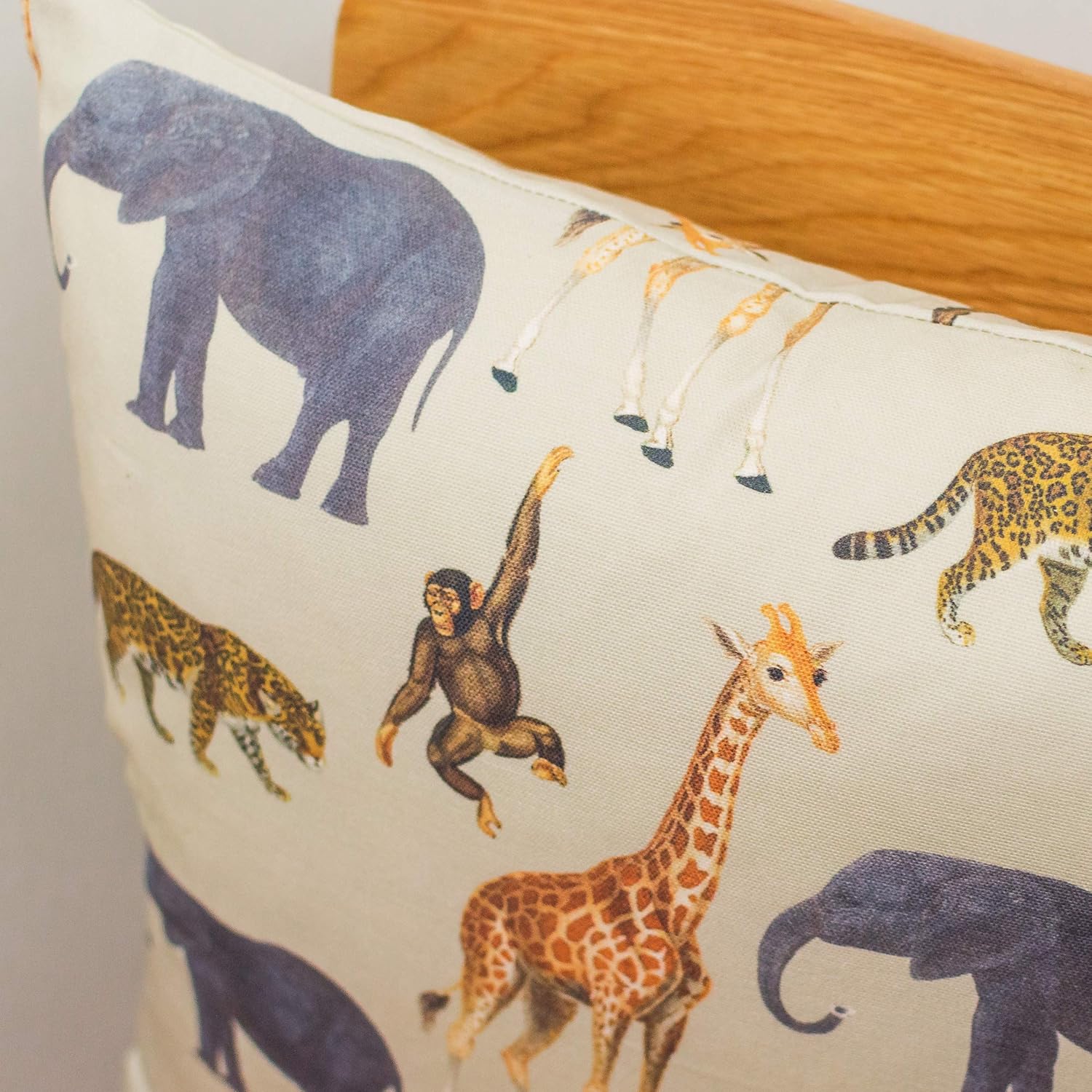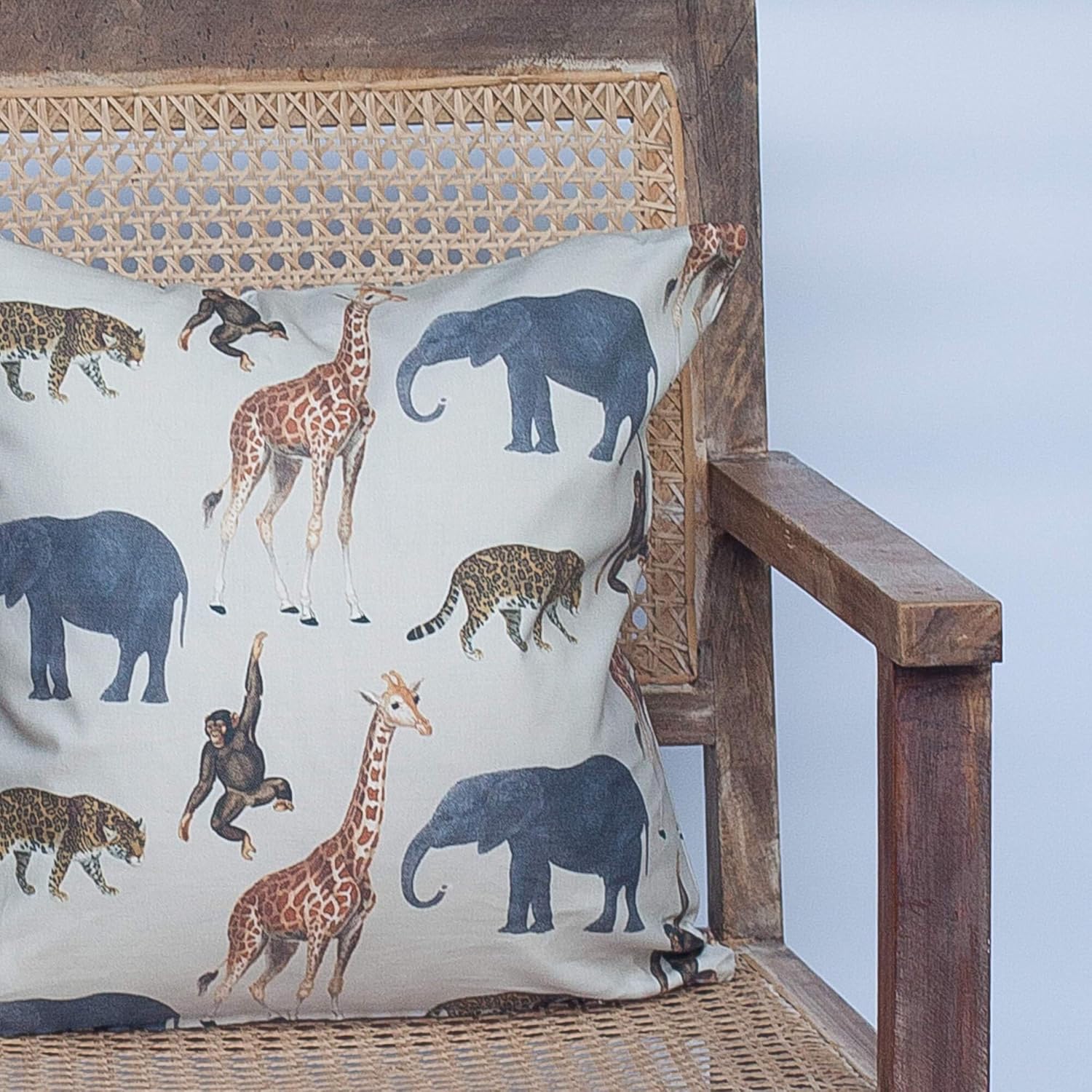 Everyone’s favourite safari animals are printed onto this crisp cotton cushion cover in stunning quality thanks to the digital printing techniques. Giraffes, elephants, monkeys, and tigers are set against a beige background for flexibility to suit any room or style.