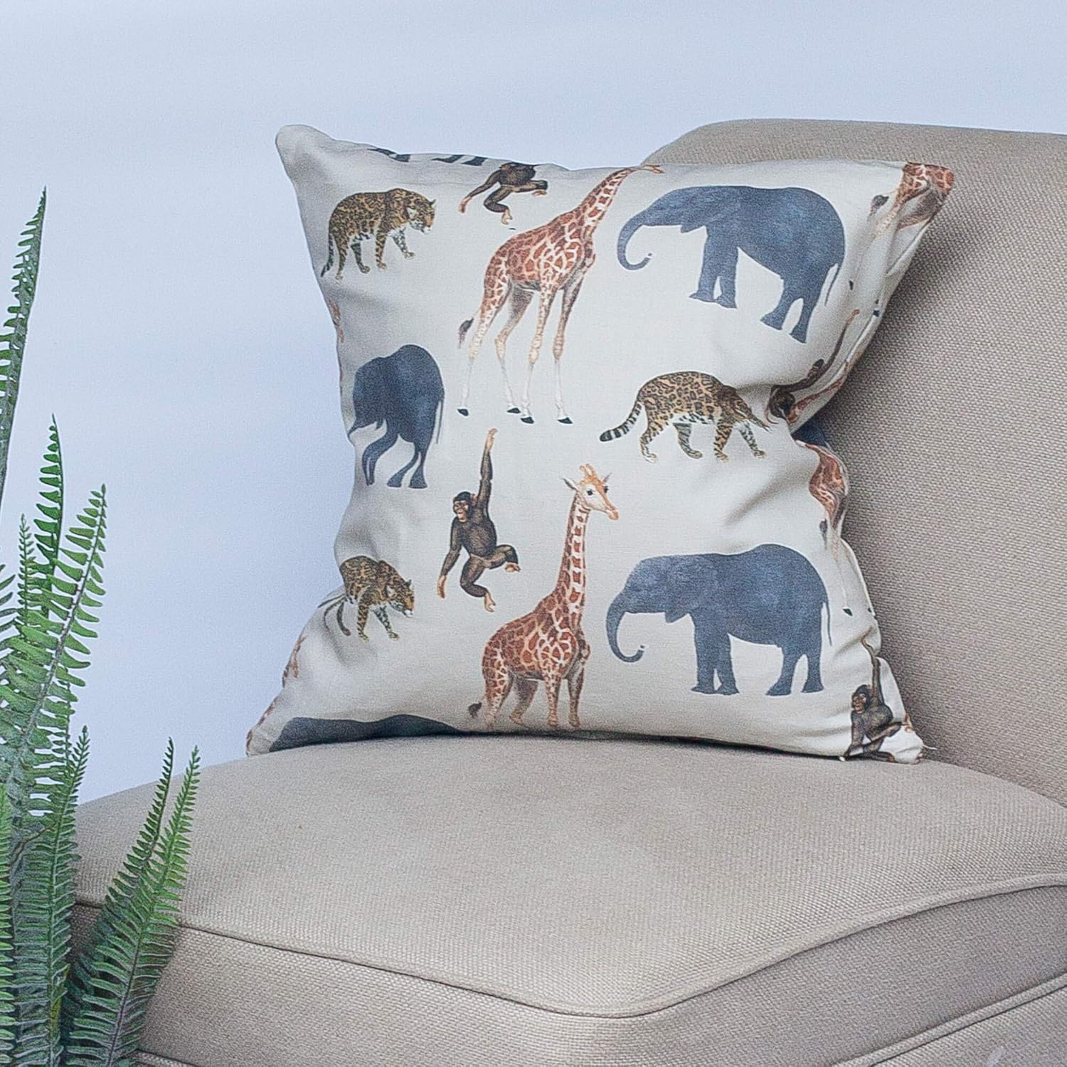 Linen Loft Zoo Animals Cushion Cover. Giraffes, Elephants, Tigers, and Monkeys. Double Sided, 43cm (17″) Square Pillow. 100% Cotton. Nursery Kids Accessory.