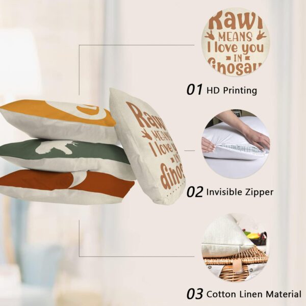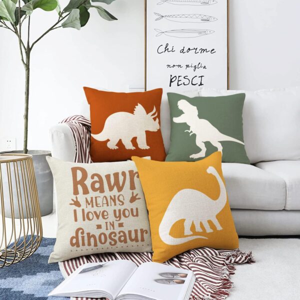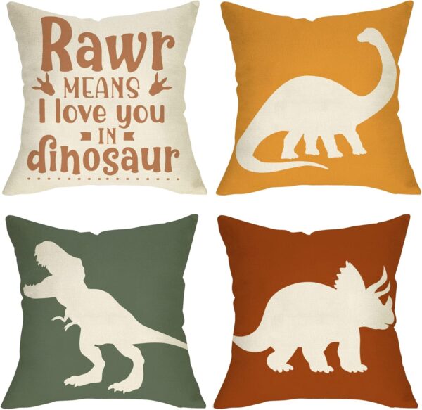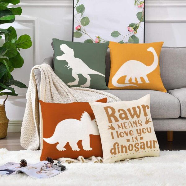 Exquisite Design: This 4-piece pillow cases with cute cartoon dinosaur theme, printed with prehistoric paleontologist cartoon images of tyrannosaurus rex, triceratops and brachiosaurus. The colors of the pillowcases are yellow, green and orange.One of the pillowcases says that motivational quote that rawr means i love you in dinosaur