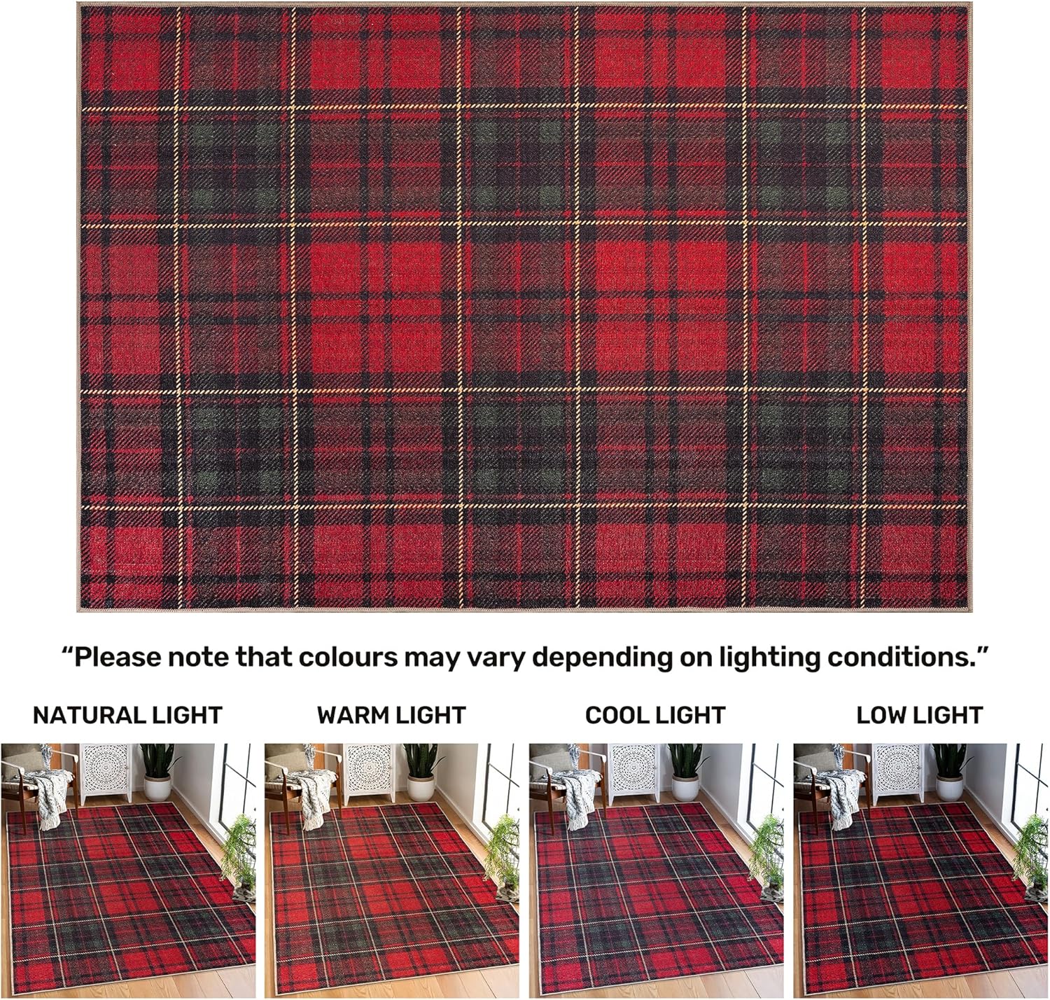 Arty Rugs Machine Washable Rug, 200x290cm, 75% Recycled Cotton, Short Pile, Non-Slip Backing, Non-Shedding, Area Rugs for Living Room, Bedroom, Kitchen, Hallway, Office, Red Tartan