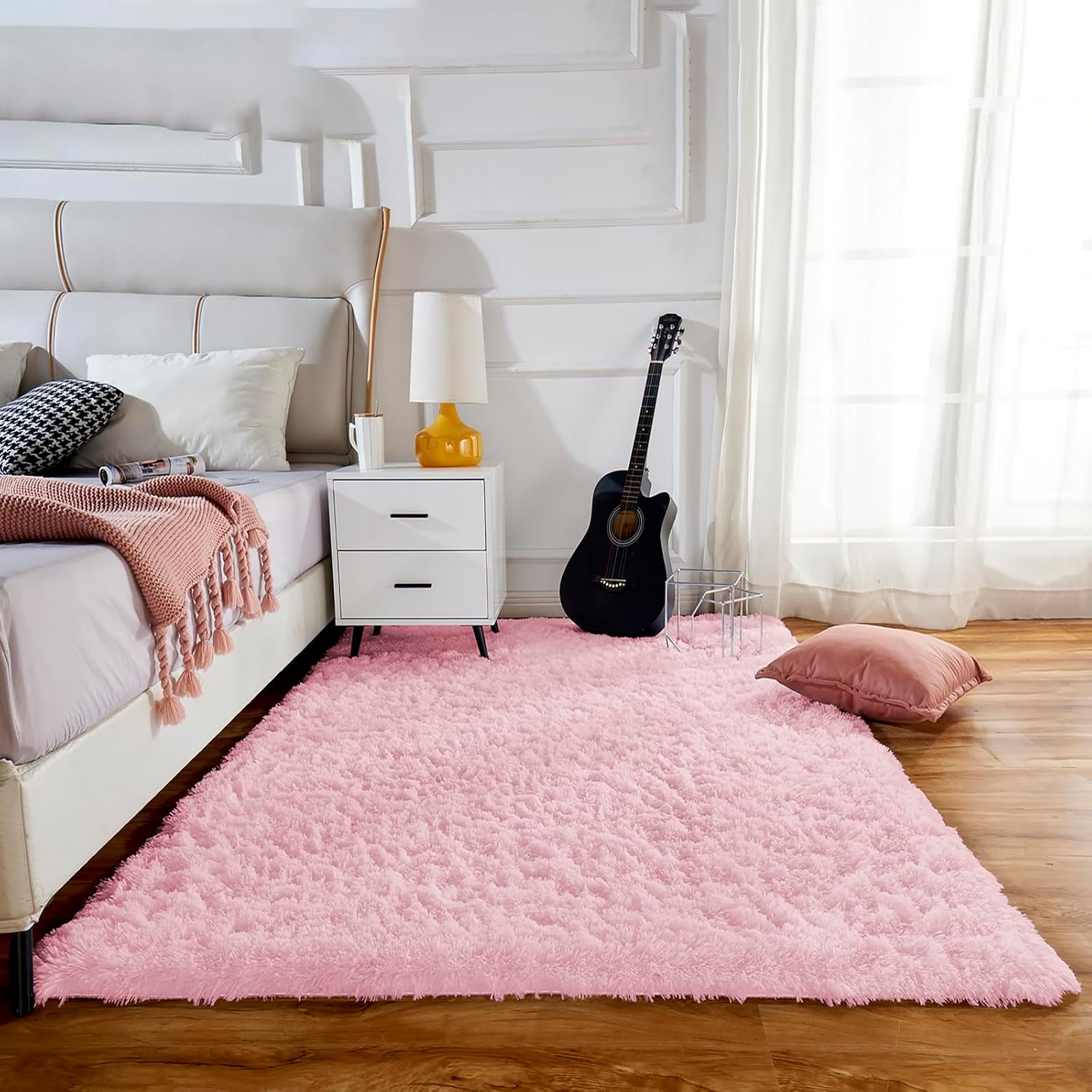 Washable Rug: This shaggy rug is not only comfortable and beautiful, but also easy to clean and care for, which saves your precious time.Dust and dirt on the carpet can be easily removed with a vacuum cleaner or by wiping with a damp cloth to keep the rug clean. For deeper cleaning, wash with a neutral detergent and cold water, then leave the bedroom rug to dry in a ventilated area