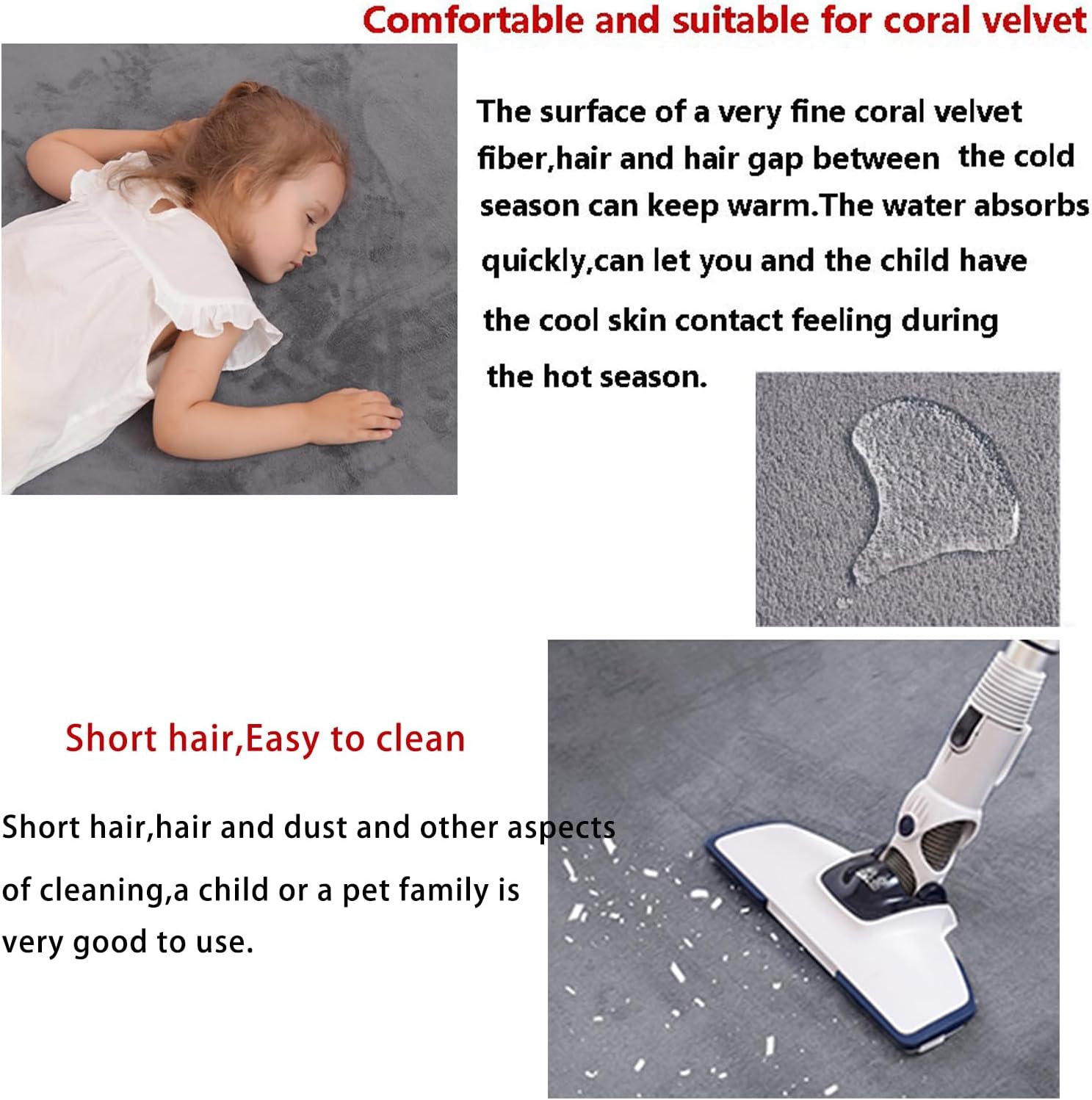 Thickened Fluffy Carpet— These carpets are soft and comfortable with 2 cm thickened fluffy short pile. The carpet is composed of three parts: the top material is high-quality coral fleece fabric, the main component is polyester fiber, the interlayer part is slow rebound memory foam, and the bottom layer is placed with non-woven anti-slip particles.