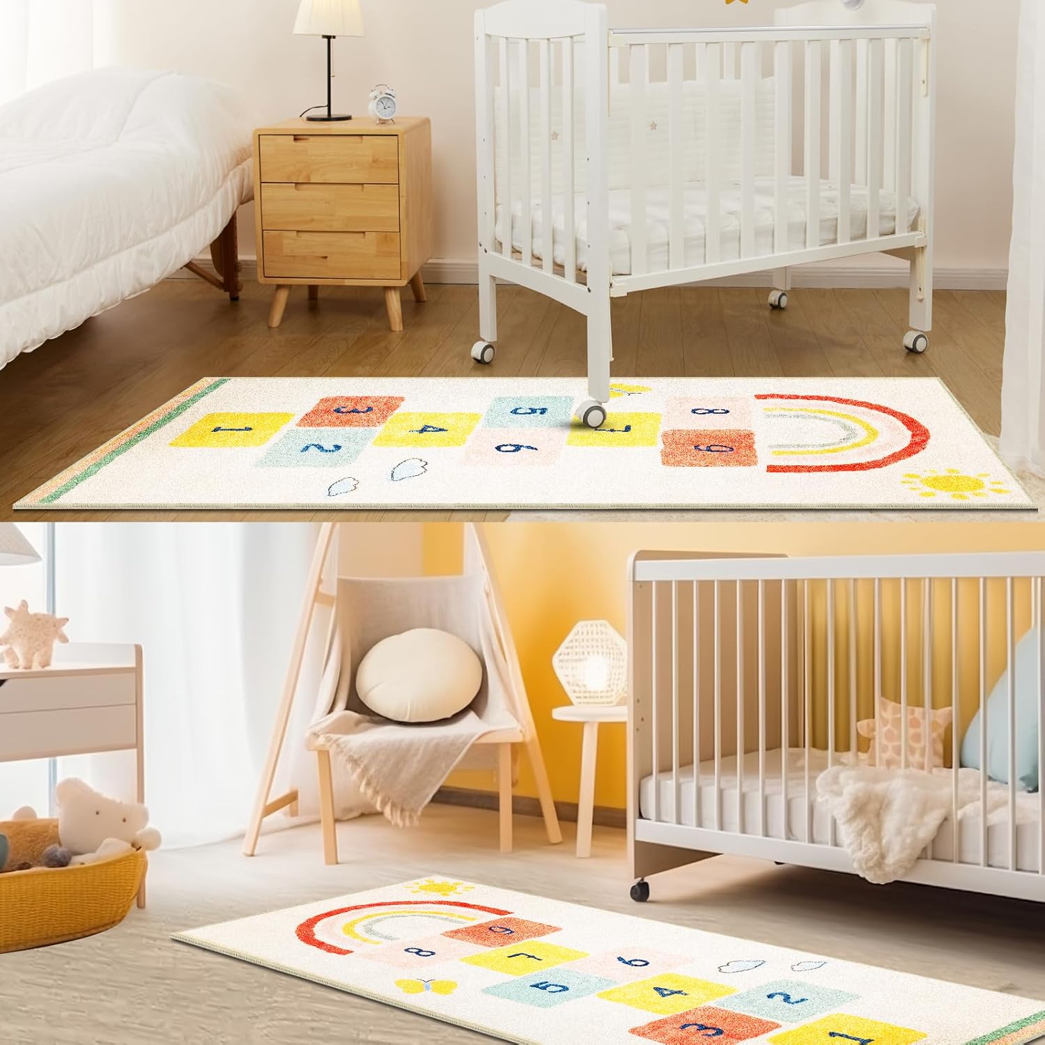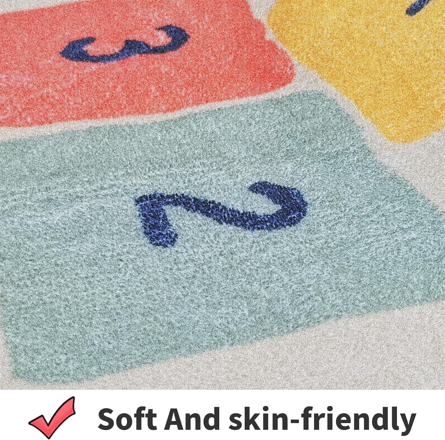 Fun and Educational Design: Featuring the classic hopscotch game, this rug provides hours of active play and learning. Vibrant elements like the sun, birds, and rainbows add a cheerful touch, while the creative design encourages number recognition and counting through interactive play.