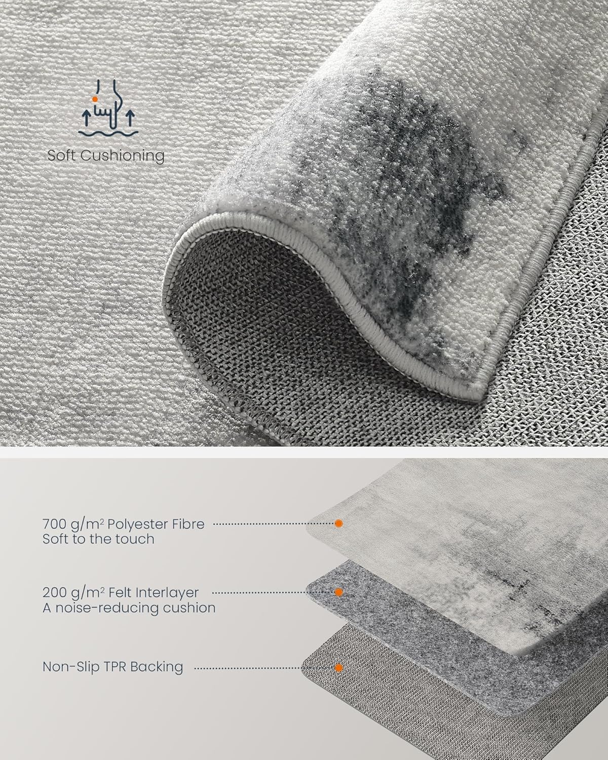 【SOFT CUSHIONING】Step into comfort with our 1 cm thick rug, combining 700 g/㎡ polyester fibres and a 200 g/㎡ felt interlayer. Perfect for easing into your day or enjoying a moment of relaxation