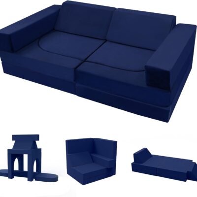 MeMoreCool 10-Pieces Kids Play Sofa, Modular Toddler Chair for Playroom, Fold Out Foam Couch Bed for Girls Boys, Children Convertible Sectional Couch Playset, Navy Blue