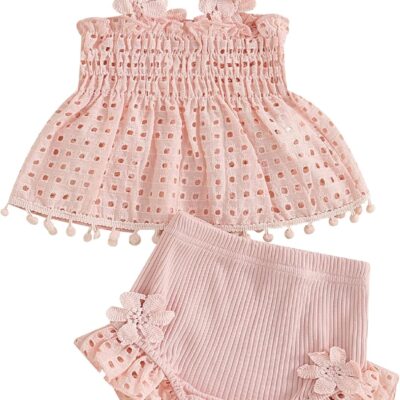 LYSINK Toddler Baby Girls Summer 2pcs Outfit Sleeveless Pleated Cutout Floral Tank Tops Stretch Ruffle Bloomers Shorts Sets