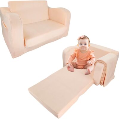 Wonder Space Kids Foam Couch with Blanket, Pre-Assembled Toddlers 2-in-1 Convertible Sofa, Indoor Foadable Lounger Chair & Flip Open Floor Bed for Boys & Girls (Champagne)