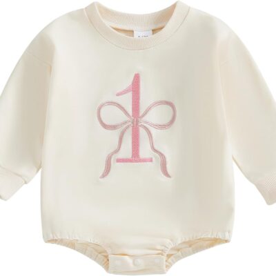 MAHUAOYIXI Newborn Baby Girls First Birthday Outfits Letter Bow Number Embroidery Romper Long Sleeve Bodysuits Toddler Infant Girls Clothes Birthday Gift For Baby Girl