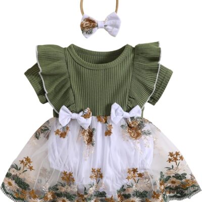 LYSINK Newborn Baby Girl Romper 2Pcs Sets Short Sleeve Mesh Tutu Dress Flower Lace Ruffle Jumpsuits Dress with Headband