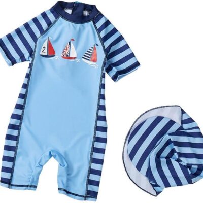 PythJooh Toddler Baby Boys One-Piece Swimsuits Stripe Boat Swimwear Long Sleeve Rash Guards Bathing Suit with Hat UPF 50+