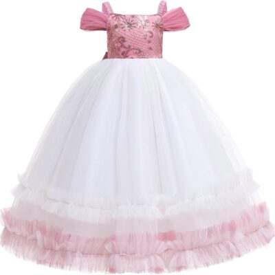 Gualiy Girl Prom Ball Gown, Bridesmaid Dress Girl 5-13 Years Mauve Off Shoulder Embroidered Tulle Dress Long with Bow on Back Sleeveless Dresses