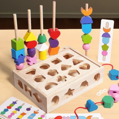 FROVOL Lacing Beads Toy Set Wooden Beads & Stacking Toy Set Shape Matching Stackers & Sequencing & Skill For Cognitive Blocks Motor