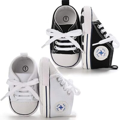 Baby Girls Boys Shoes Soft Anti-Slip Sole Newborn First Walkers High Top Canvas Denim Unisex Infant Sneaker, E01-2 Pairs/Black+white, 6-12 Months