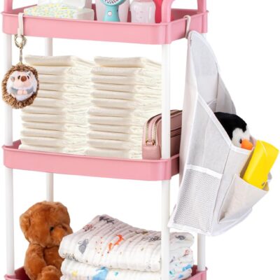 Barydat Baby Diaper Cart with Wheels and Handle 3 Tier Rolling Cart Diaper Organizer with Hanging Diaper Stacker Nursery Caddy Baby Organizer for Storage Baby Clothes, Wipes, Bibs, Table Mats (Pink)