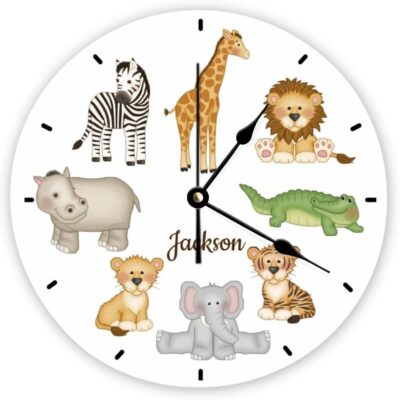 GTDEALS No Ticking Wall Clock Safari Jungle Animals with Personalized Name for Kids,girl,boy Round Modern Wooden Clocks for Bedroom Living Room Home Office School Wall Art Decor 12 Inch, S7LCLOCK