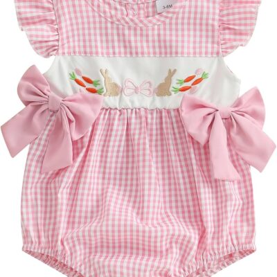 M9ppzzur7 Baby Girl Easter Romper Bunny Carrot Embroidery Plaid Ruffle Sleeve O Neck Bubble Bodysuits Smocked Romper