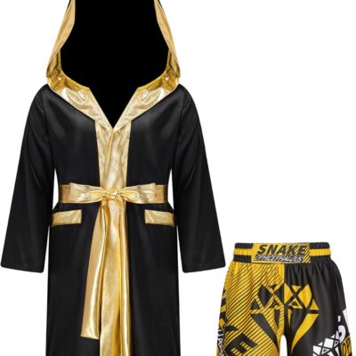 Miaeowve Kids Boys Boxing Outfit Open Front Hooded Grown Cloak Metallic Satin Robe with Belt and Boxer Shorts Set