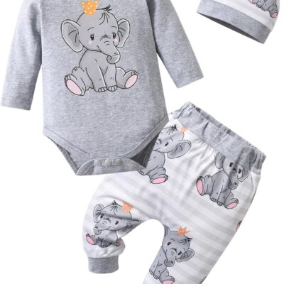 Planooar Baby Clothes Set Baby Boys Long Sleeve Elephant Print Top+ Pants+Hat