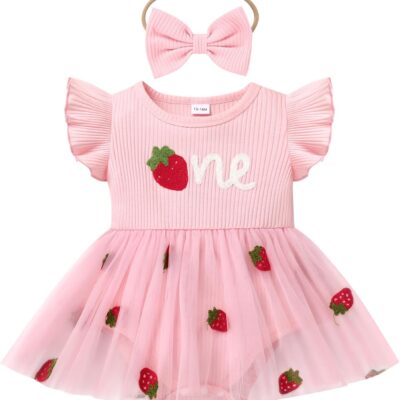 Odizli Baby Girls 1st Birthday Outfit Flutter Sleeve Ribbed Knit One Embroidered Tulle Romper Dress + Headband Cake Smash Photo Shoot
